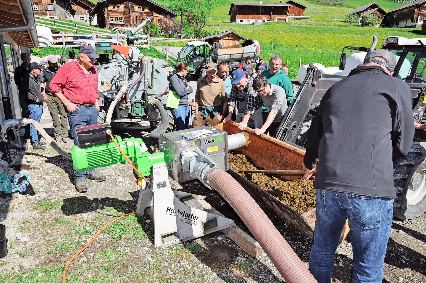 Auf grosses Interesse stiess die Vorführung des Hochdorfer Gülleseparators durch die Firma Landmaschinen Jenny AG. Die Herausforderungen bei der Düngung, die mit der Zunahme von Laufställen sowie dem Schleppschlauchobligatorium gestiegen sind, können mit dem Separieren von Gülle und Mist optimiert werden. Der Hochdorfer Verkaufsberater Beat Süess stellt mit «Vakublitz» eine einfache, kostengünstige Lösung vor, die anschliessend vor Ort vorgeführt wurde.