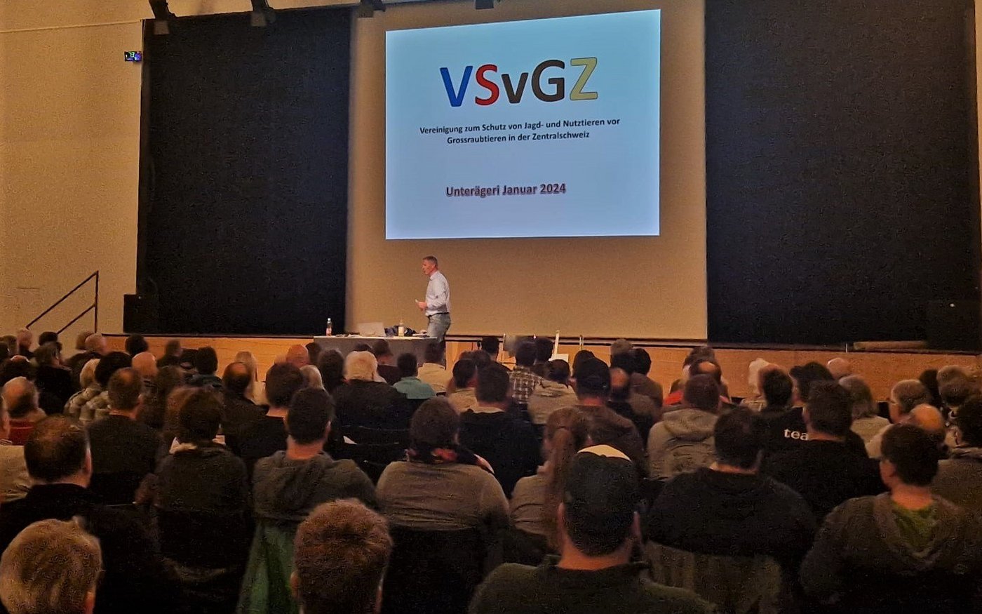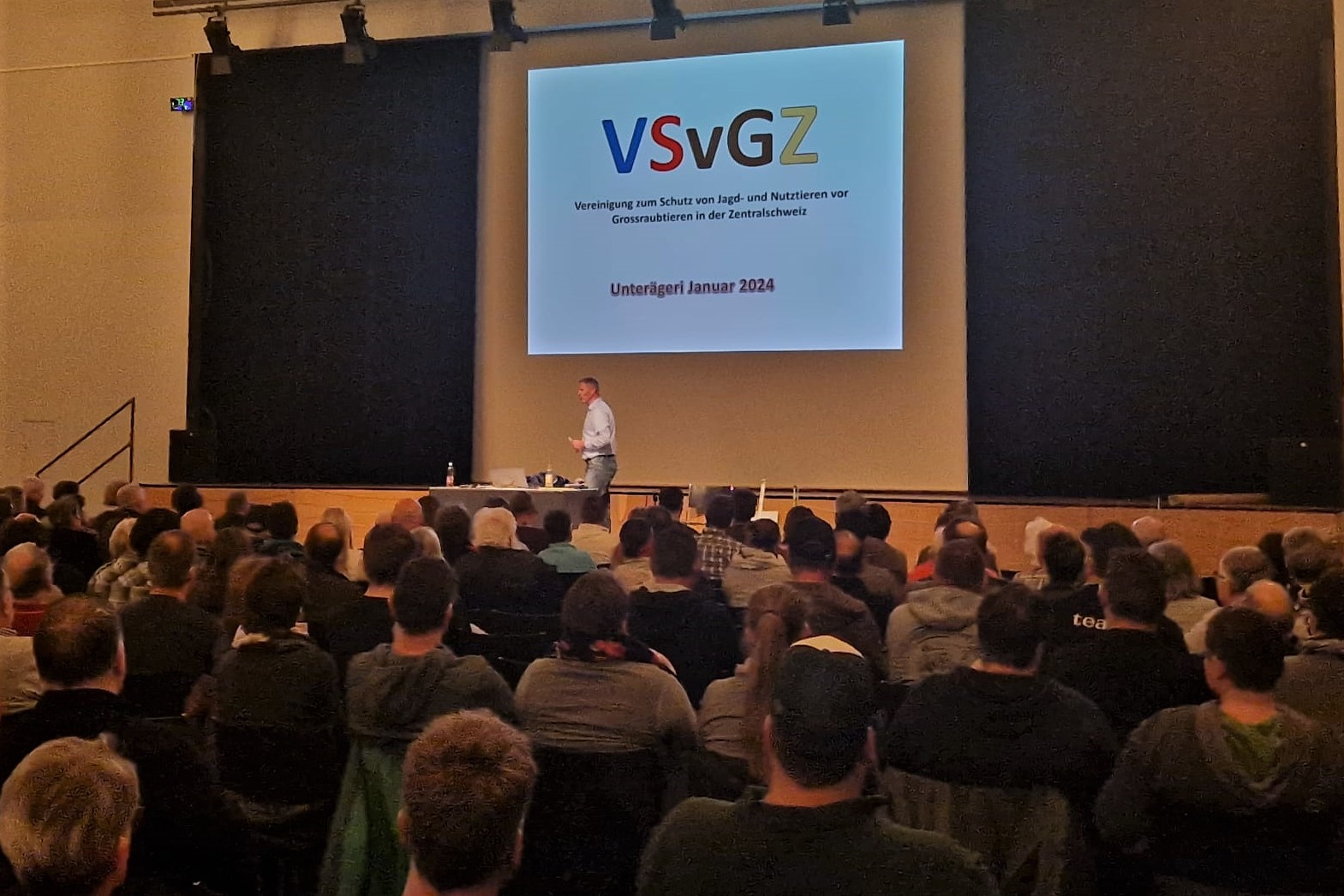 Am öffentlichen Vortrag «Wölfe im Mittelland» in der Ägerihalle in Unterägeri nahmen rund 400 Interessierte teil. Der Anlass wurde von der Vereinigung zum Schutz von Jagd- und Nutztieren vor Grossraubtieren der Zentralschweiz (VSvGZ) und vom Initiativkomitee «Nationale Wolfsinitiative» organisiert.