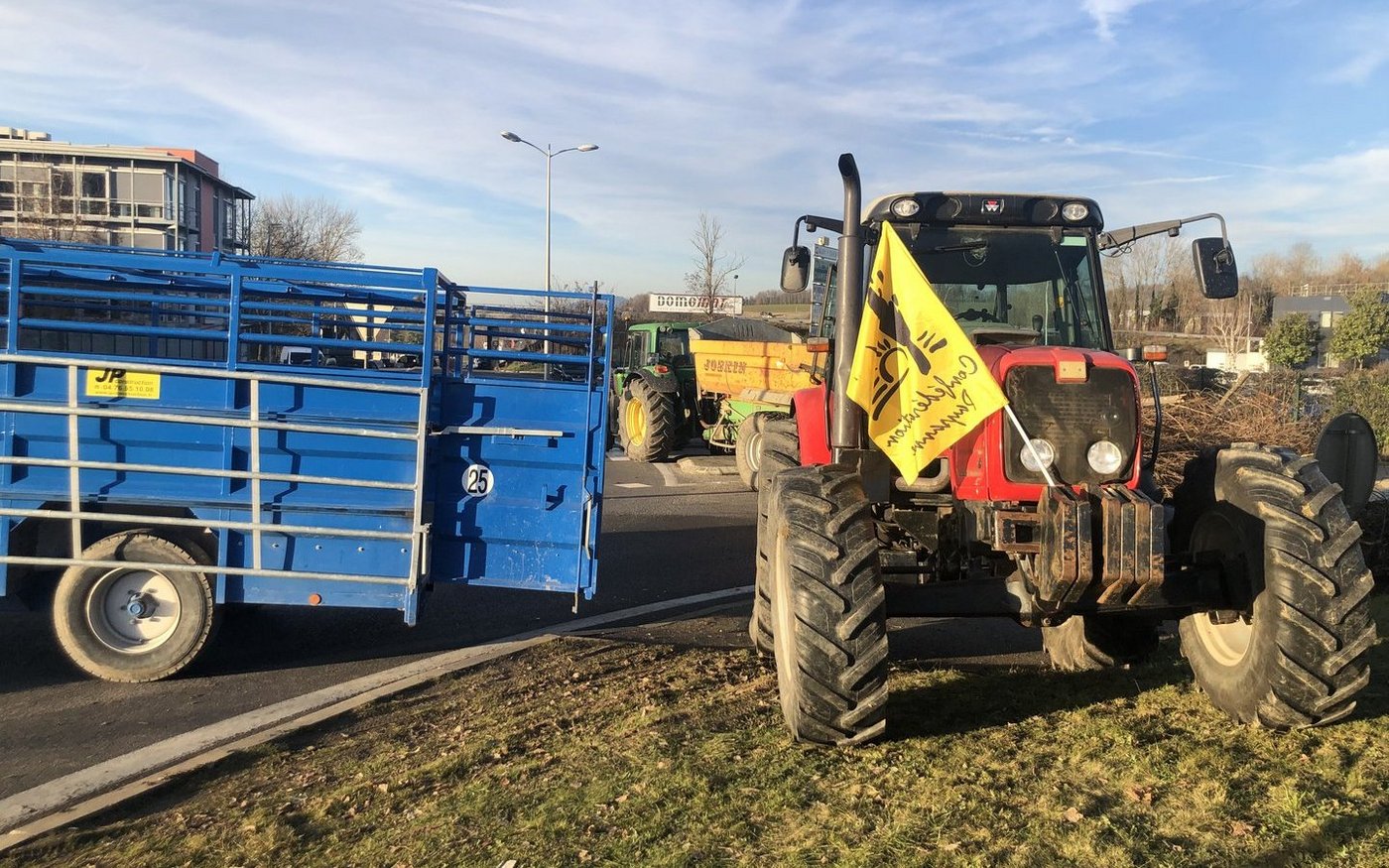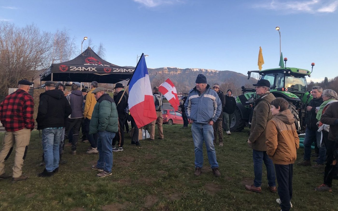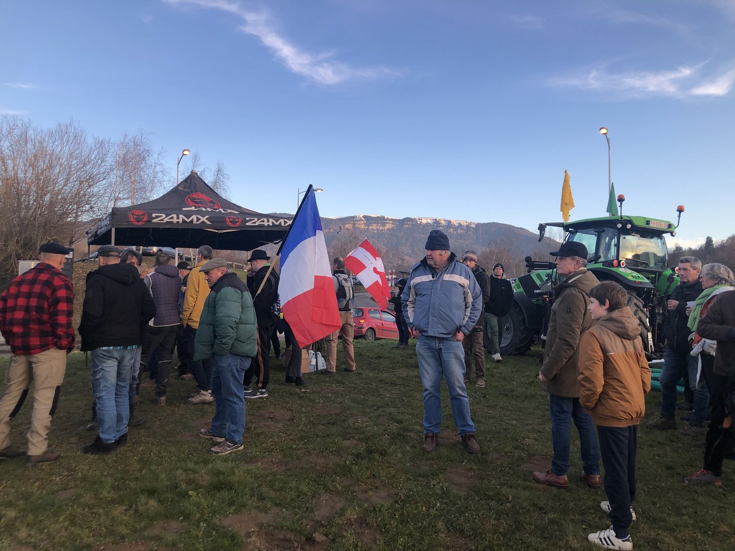Über dem ganzen Platz vor der Autobahn-Mautstelle von Alby-sur-Chéran, hängt am Donnerstagnachmittag der beissende Rauch einer brennenden Rundballe. Die Autobahnauffahrt wird von Bauern mit Traktoren, Anhängern und fuderweise Mist, Stroh und Astmaterial blockiert. Auf dem Verkehrskreisel vor der Mautstelle stehen etwa hundert Bauern und diskutieren zusammen. Die Lage ist vorerst friedlich. Auf einem Wagen stehen Getränke und Verpflegung für die Demonstranten. Eine grosse Anzahl Gendarmen sichern den Zugang zur Mautstelle ab und beobachtet das Geschehen, greifen aber nicht ein.