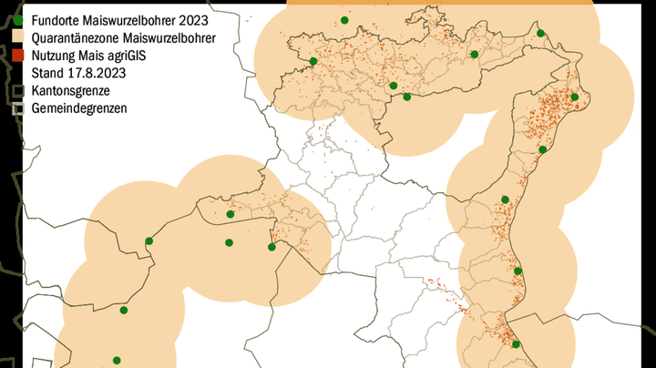 Seit dem Jahr 2000 wird die Situation des Maiswurzelbohrers mittels Pheromon-Fallen in der Schweiz jährlich überwacht. Für die Saison 2023 sind gemäss der Abschlusskarte der Gebietsüberwachung 2022 von Agroscope alle Kantone mindestens teilweise von Fruchtfolgemassnahmen betroffen. In der Ostschweiz ist die Situation unterschiedlich.