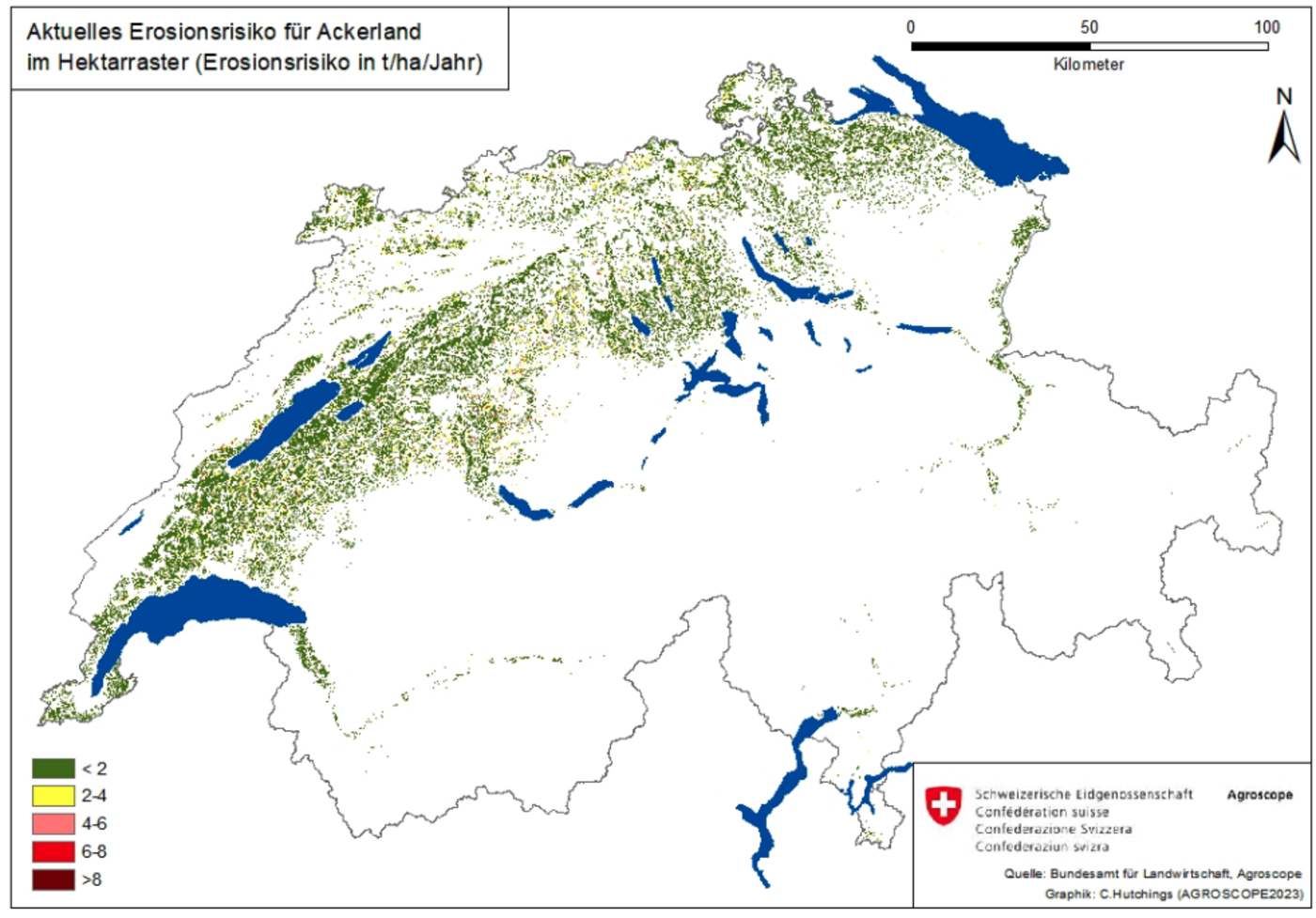 Die Verordnung über Belastungen des Bodens (VBBo) stuft ein Erosionsrisiko von maximal 2 t/ha und Jahr als tolerierbar ein. Auf der Agroscope-Karte zum aktuellen Erosionskarte fallen 90 Prozent der Schweizer Ackerflächen in diese Kategorie.