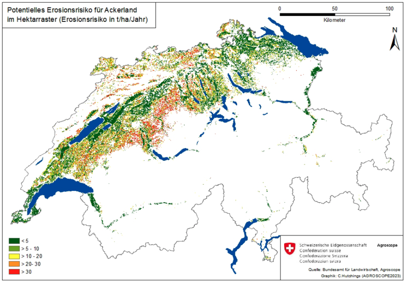 - Den vollständigen Bericht «Der Agrarumweltindikator Erosionsrisiko, kulturspezifische C-Faktoren sowie eine Karte des aktuellen Erosionsrisikos in der Scheiwz» von Agroscope Science finden Sie hier.