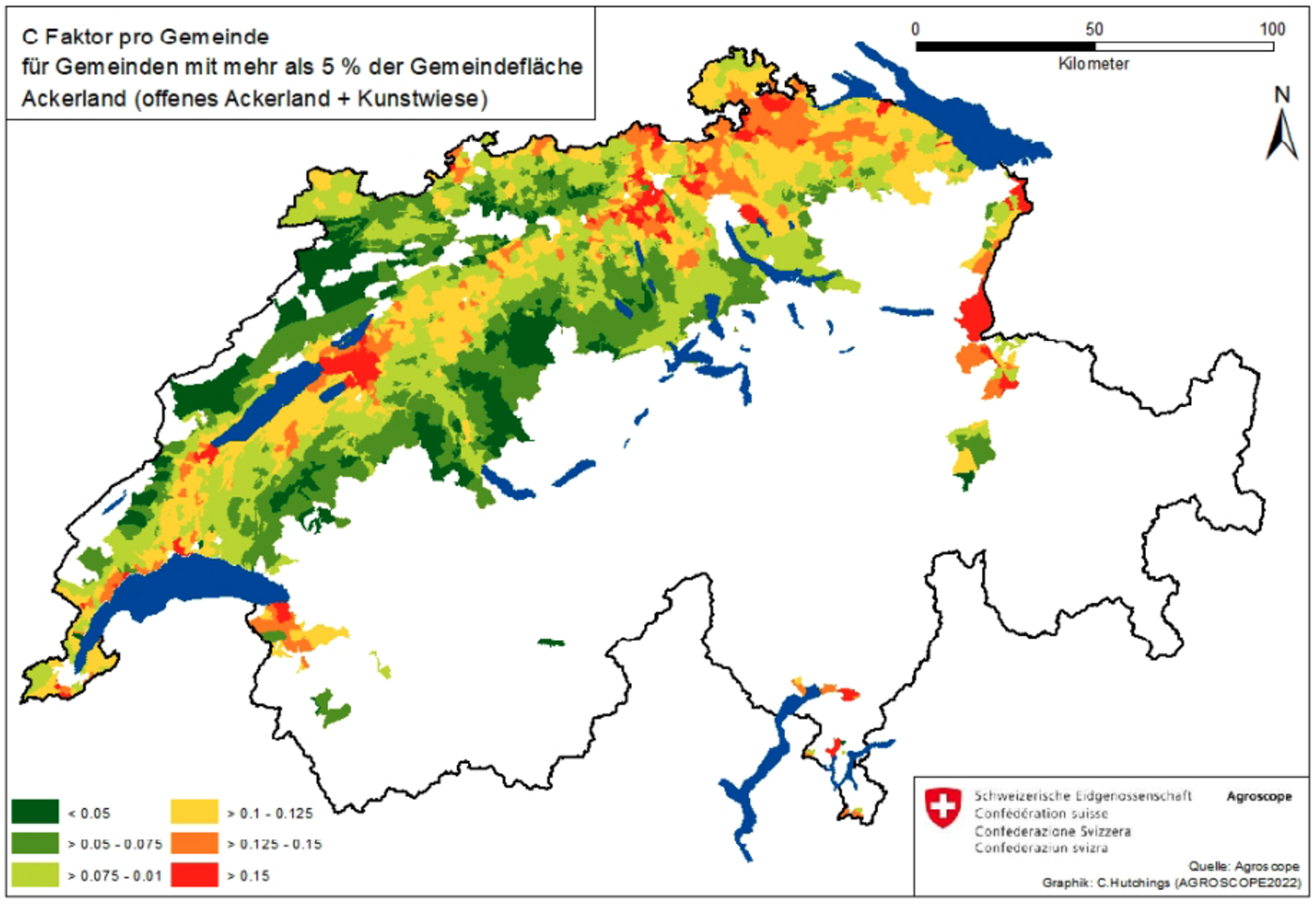 Basierend auf statistischen Daten zur Verteilung von Ackerkulturen und den zuvor errechneten C-Faktoren für die jeweilige Kultur konnte eine Karte zum mittleren C-Faktor je nach Gemeinde erstellt werden. Hierbei floss auch die Bewirtschaftungsart ein – man nutzte Informationen des Bundesamts für Landwirtschaft (BLW) über die Teilnahme am Ressourcenprojekt «schonende Bodenbearbeitung» mit Flächenangaben zu Direkt-, Streifenfräs- oder Mulchsaat im Jahr 2020. Die Kulturartenverteilung pro Gemeinde (ebenfalls vom BLW) gab Aufschluss über das das Angebaute, berücksichtigt wurde weiter die Lage einer Gemeinde im Hügel- oder Talgebiet.