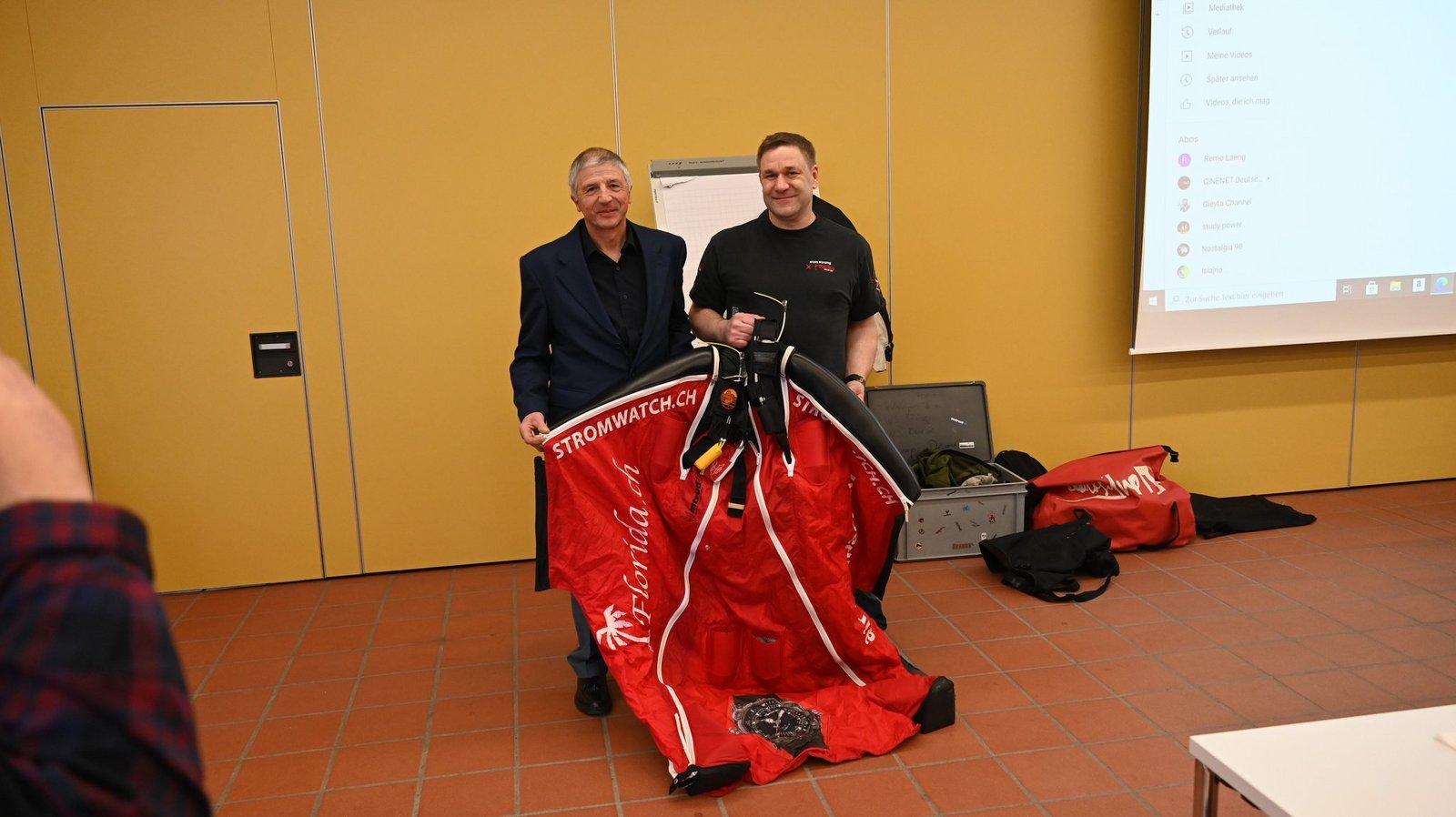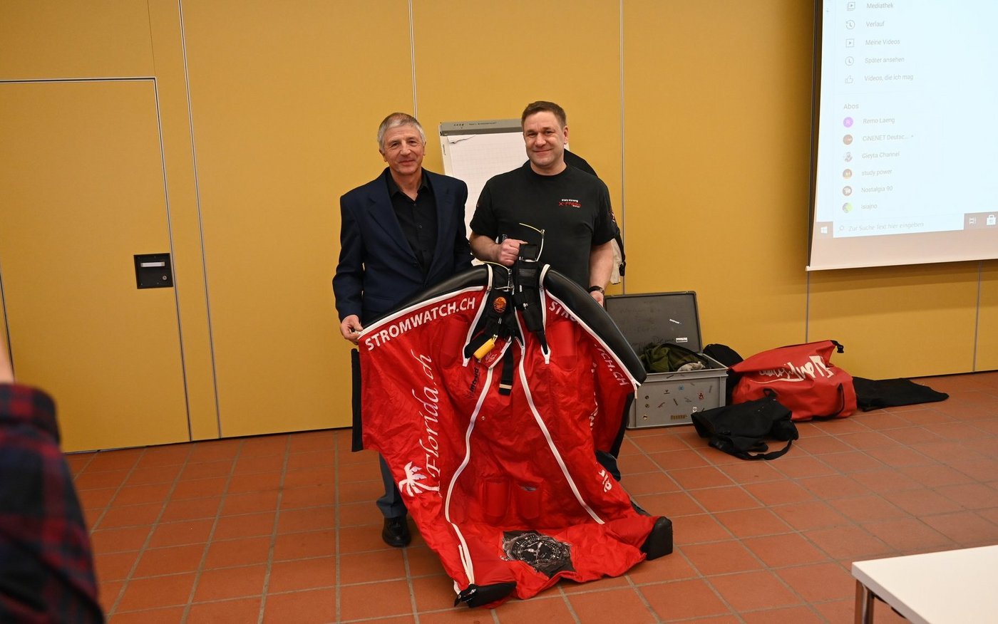 Im Anschluss brachte Remo Läng, Seeländer Extremsportler und «König der Lüfte», den Obstproduzenten seine Leidenschaft für das Fallschirmspringen und das Fliegen mit dem Wingsuit näher. Er zog Parallelen zwischen dem Extremsport und der Landwirtschaft. Dabei machte er deutlich, warum Höhenangst zuoberst auf der Leiter im Apfelbaum zum Problem werden könne, jedoch hoch oben in der Luft kein Thema sei. Der Horizont macht dabei den Unterschied.