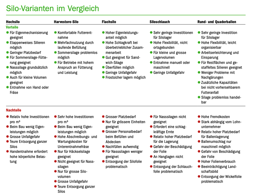 Wenn diese Annahmen getroffen wurden, stellt sich die Frage nach dem idealen Lagersystem. Für das Hochsilo sprechen laut René Bünter, dem Geschäftsführer der Silovereinigung Schweiz, der geringe Platzbedarf. Harvestore-Silos punkten mit Zeitersparnis durch die Unterentnahme und mit der Möglichkeit zur kontinuierlichen Befüllung. Bei Fahrsilos bieten sich viele Kombinationsmöglichkeiten wie Sandwich-Silagen, Überfüllen und Selbstfütterung an. Siloschläuche wiederum sind nicht ortsgebunden und in der Handhabung flexibel. Die gleichen Vorteile gelten für Rund- und Quaderballen. Zusätzlich gelten hier laut Bünter die Verteilung des Risikos von Fehlgärungen und die Handelbarkeit als weitere Vorteile.