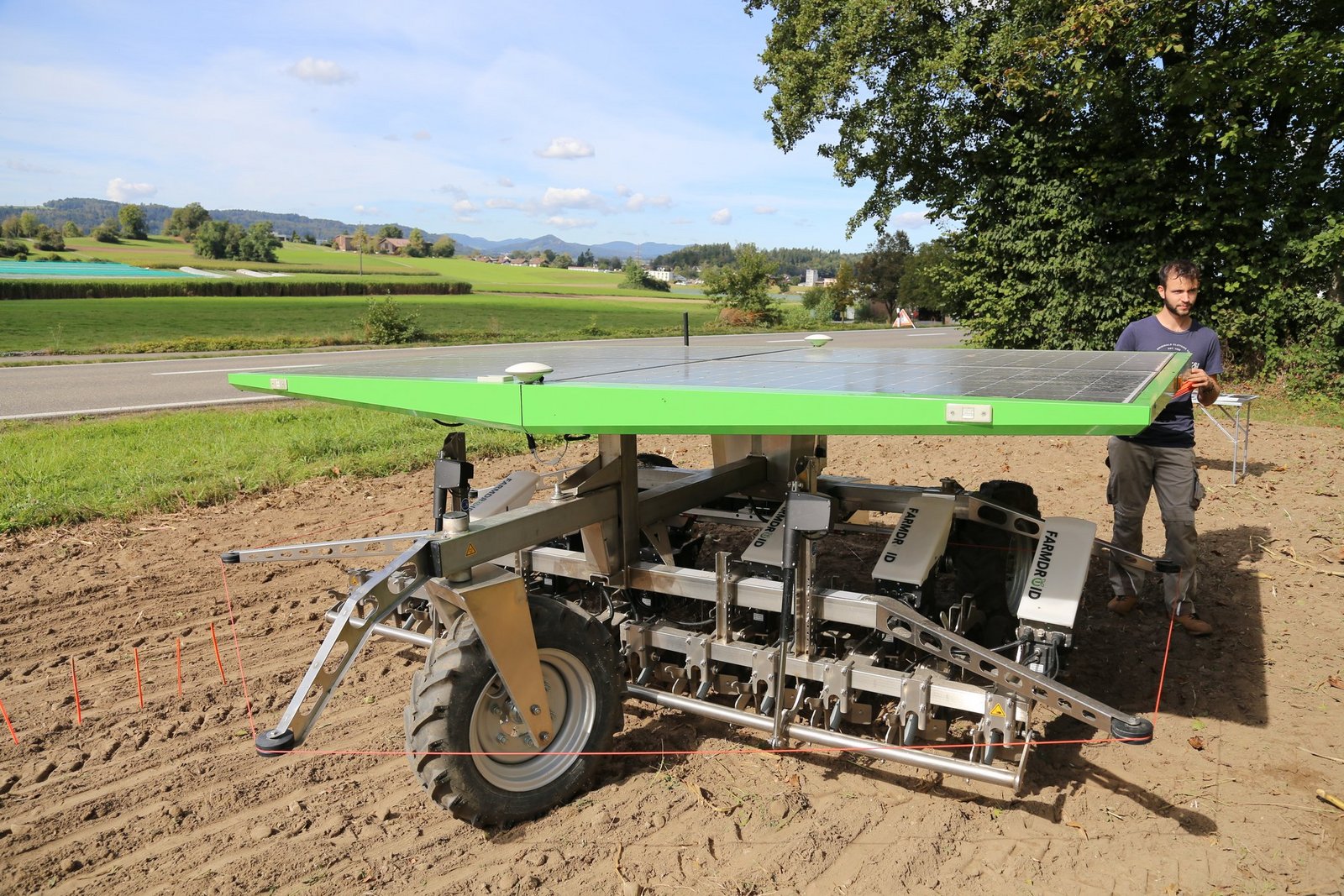 Dass technologische Entwicklungen die Arbeit erleichtern und gleichzeitig klimaschonend betrieben werden können, zeigte am Anlass von FiBL und Bio Suisse ein Sä- und Hackroboter, der aktuell im zweiten Jahr im Bio-Zuckerrübenbau getestet wird. Der Farmdroid basiert im Gegensatz zu vielen anderen Robotern nicht auf Kameratechnik und ist deshalb deutlich günstiger. Er setzt auf zentimetergenaues GPS, so dass er auch zwischen den wachsenden Zuckerrüben jäten kann, ohne diese zu beschädigen. Die ersten beiden Jahre hätten gezeigt, dass mit dem Roboter Arbeitsstunden gespart und hohe Erträge erzielt werden könnten, sagte David Vetterli vom FiBL, der den Roboter auf dem heimischen Biobetrieb im Kanton Thurgau zusammen mit seine Vater testet und darüber aktuell seine Masterarbeit schreibt. Besonders im ersten Jahr hätten sich noch Kinderkrankheiten gezeigt, die aber zum grossen Teil behoben werden konnten. Das Besondere am Roboter: Dank seiner Solarzellen kann er völlig autark 24 Stunden und 7 Tage im Einsatz sein. Nur, wenn die Tage noch sehr kurz seien, könne dem Roboter in der Nacht mal der Schnauf ausgehen, so Vetterli.