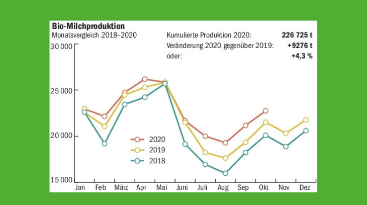 Im vergangenen Jahr kamen 155 Biobetriebe neu auf den Milchmarkt. Das führte zu einem Produktionszuwachs von über 4 % gegenüber 2019. Zwar hat der Absatz im vergangenen Jahr stark zugenommen. «Nach aktueller Schätzung dürfte der Absatz von Biomilch-Produkten im Detailhandel letztes Jahr um 15 % gegenüber Vorjahr gestiegen sein», schreibt Lukas Inderfurth von Bio Suisse auf Anfrage. Deshalb habe man die Wartelisten für neue Bio-Milchlieferanten Ende Mai 2020 aufgehoben.
