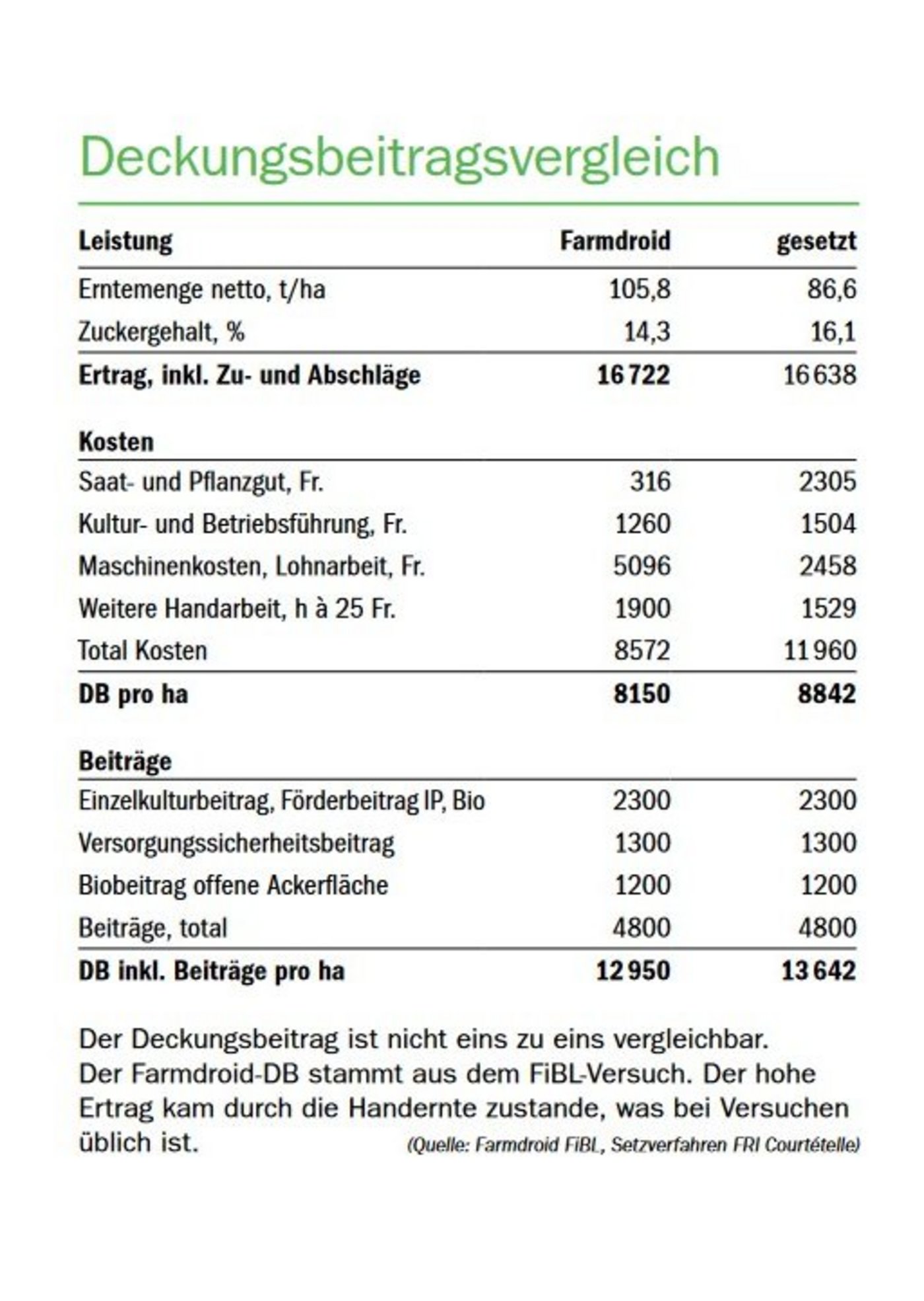 Tobias Gelencsér lieferte Zahlen vom Farmdroid-Säen auf dem Betrieb Vetterli im Versuchsaufbau. Der hohe Ertrag kam durch die Handernte zustande. Das sei bei den Zuckerrübenversuchen so üblich. Der keineswegs allgemein gültige Deckungsbeitrag 2022 beträgt Fr. 12 950.–/ha (siehe Tabelle). [IMG 2]