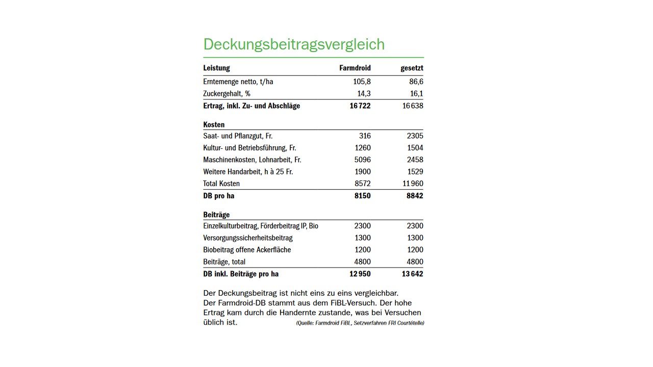 Das Pflanzverfahren wertete Brieuc Lachat von der Landwirtschaftsschule Courtemelon aus. Der Deckungsbeitrag ist höher. In beiden Verfahren liegt der Deckungsbeitrag über jenem des herkömmlichen Verfahrens mit Handjäten und Säen. Laut aktuellem Agridea-Deckungsbeitragskatalog beträgt dieser Fr. 10 436.–/ha für Biorüben bei einem Ertrag von 50 t.