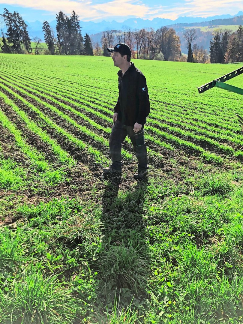 Bei der Bodenbearbeitung will Patrik Huber schonend vorgehen und arbeitet die Gründüngungen mit einem intensiven Grubber ein. Der Weizen wir mit einer konventionellen Säkombination eingedrillt. Ein wichtiger Teil von Hubers Strategie sind Biostimulanzien und Spurenelemente. Im Weizen verwendet er Silizium und Mangan (zusammen mit dem Herbizid im Frühling) sowie Huminsäure (auf Boden und Pflanzen) und Stickstoff-Blattdünger (im Fahnenblatt). «Ich kann die Wirkung nicht beweisen oder in Zahlen vorrechnen», räumt der Aargauer ein. «Aber ich bin Fan davon. Ebenso von Gründüngungen.»