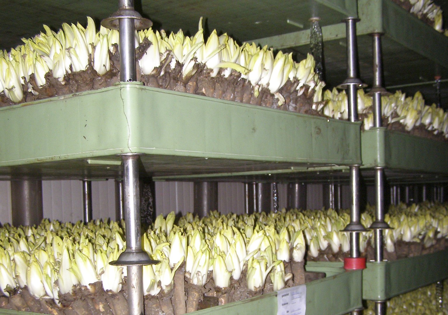 Der Anbau ist aufwändig. Zunächst müssen auf dem Feld die Samen ausgebracht werden. Er wächst danach nur langsam, die Wurzel dringt weit in den Boden ein. Schliesslich wird die Wurzel gerodet und in Kühlräumen gelagert. Dann werden die Wurzeln in den lichtdichten Räumen aufgestellt, wo sie austreiben und der Chicorée geerntet werden kann.