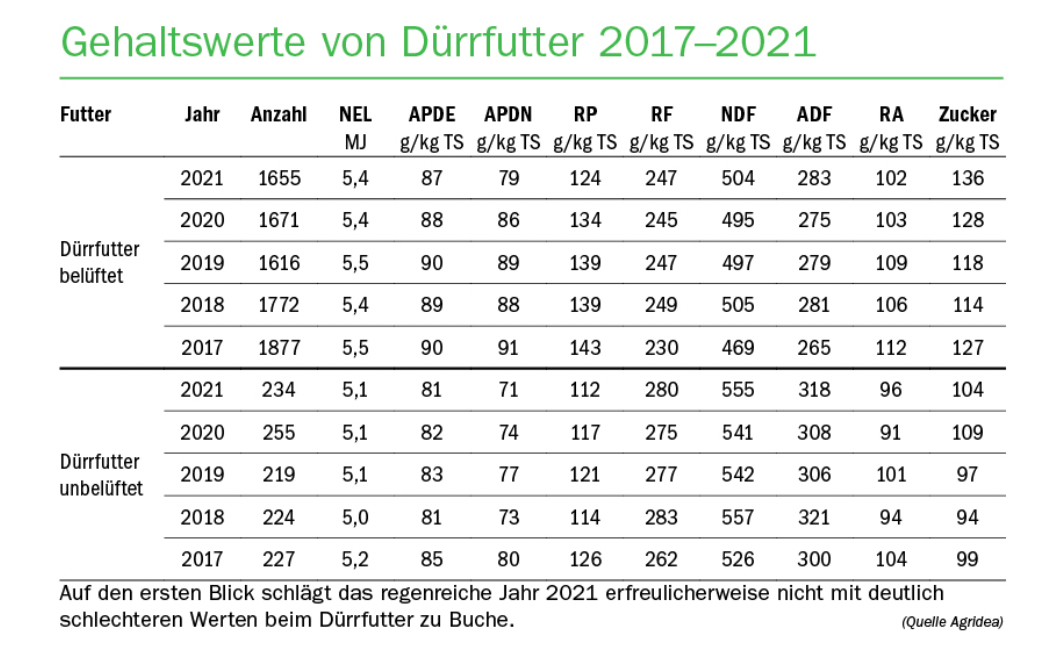 Eine genauere Betrachtung zeigt, dass die Analysegehalte des Dürrfutters 2021 teilweise leicht unter dem Durchschnitt der letzten fünf Jahre zu liegen kommen. Sowohl der mittlere Energiegehalt von belüftetem Dürrfutter mit 5,4 MJ NEL pro kg Trockensubstanz (TS), als auch jenervon bodengetrocknetem Dürrfutter mit 5,1 MJ NEL pro kg TS habe Verbesserungspotenzial. Die APDE- und APDN-Gehalte sind ausgeglichen, liegen aber leicht unter den Zielwerten. Der Rohproteingehalt liegt auffällig tiefer als der mehrjährige Durchschnitt. Dies sei unter anderem mit den schwierigeren Erntebedingungen dieses Jahres zu erklären. Die Rohfasergehalte von unbelüftetem Dürrfutter sind deutlich höher als jene von belüftetem Dürrfutter, ebenso ist der Zuckergehalt höher. «Beides spricht dafür, dass die Vorteile der Heubelüftung, Nutzung kürzerer Erntezeitfenster und schnellere Trocknung des Futters, ausgeschöpft werden konnten», bilanzieren die Agridea-Mitarbeitenden.