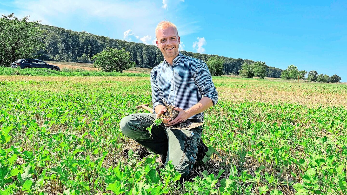Zuerst habe sich die Untersaat sehr dünn präsentiert, «ich dachte: Das war ein Griff ins Klo.» Doch zwei Tage nach dem Rapsdrusch sei die Fläche grün gewesen – der bereits etablierte Klee nutzte seine Chance, sobald die Lichtkonkurrenz weg war und bildete reichlich Blattmasse. In einem Youtube-Video zeigt Messerschmidt im Herbst, wie er Winterweizen in den Kleeteppich sät. «Das ist eine richtig schöne Bodengare hier», so sein Kommentar zum Spatenstich vor dem Traktor, der ein dichtes Wurzelgeflecht mit reichlich Knöllchen und einen Regenwurm zu Tage fördert. Auch die Geruchsprobe besteht die Handvoll Erde, die sich Messerschmidt an die Nase hält.