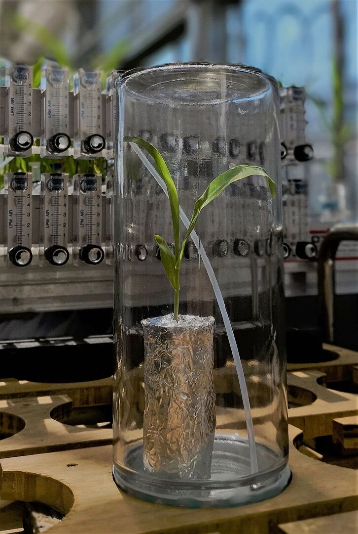 Dazu haben die Forschenden an der Uni Bern zunächst eine Anlage gebaut, in der 100 Pflänzchen in Glasflaschen über Schläuche nach Bedarf miteinander verbunden werden können. Ein Massenspektrometer erstellt jeweils ein Duftstoffprofil der Luft.