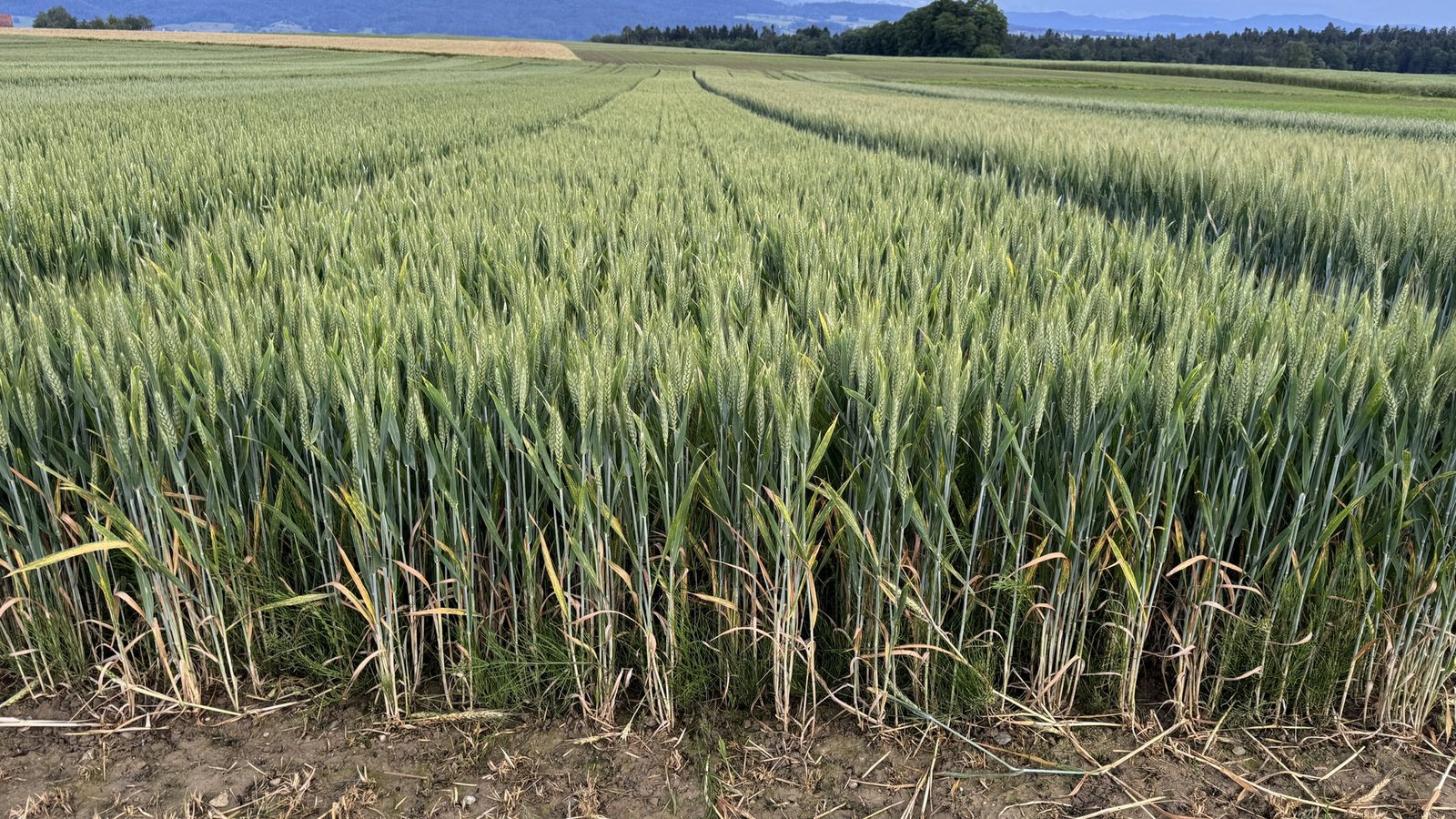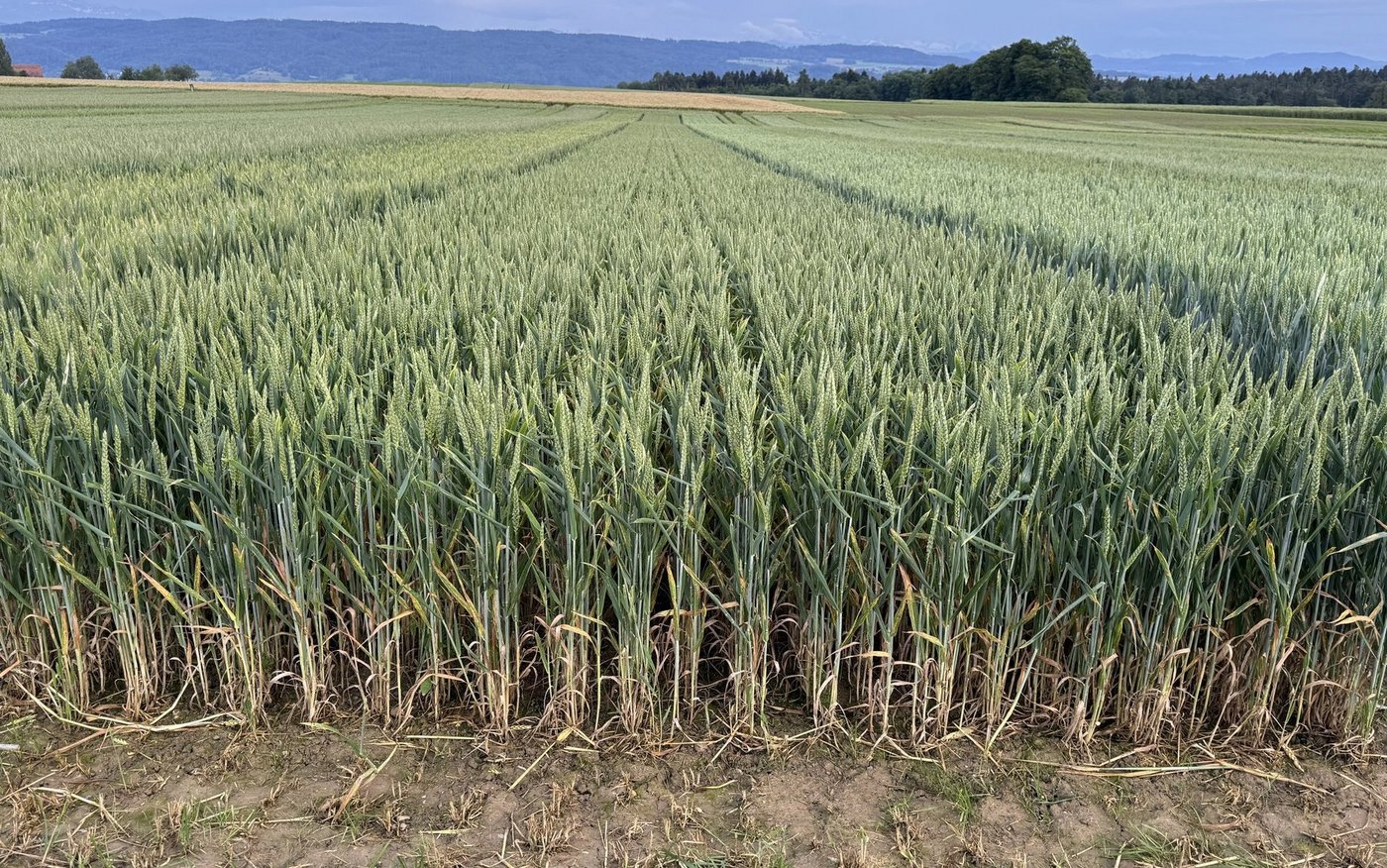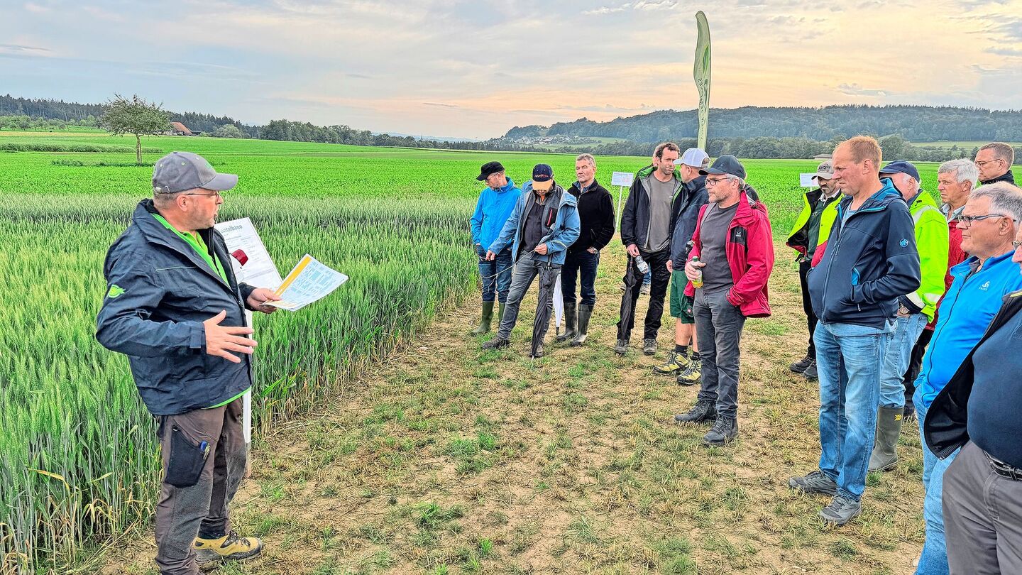 Adrian Füchter, Aussendienstmitarbeiter der UFA Samen AG, verschaffte den Teilnehmern einen Überblick; die Weizenparzelle war mittig mit einem Grünstreifen geteilt, in Richtung Thurtal wurde sie gemäss den ÖLN-Bestimmungen bewirtschaftet, in Richtung Seerücken extensiv, sprich ohne Pflanzenschutzmittel und Wachstumsregulatoren geführt.