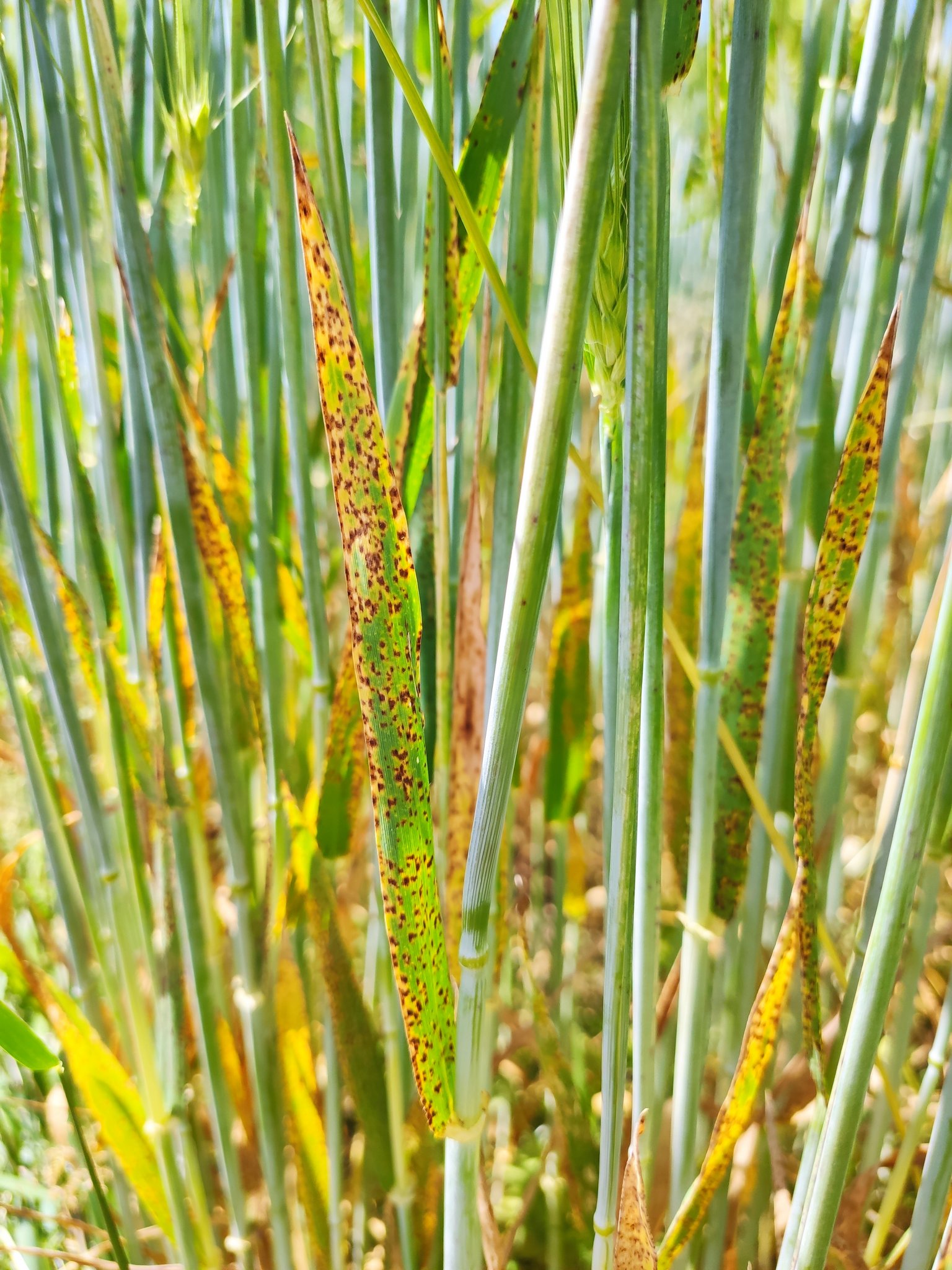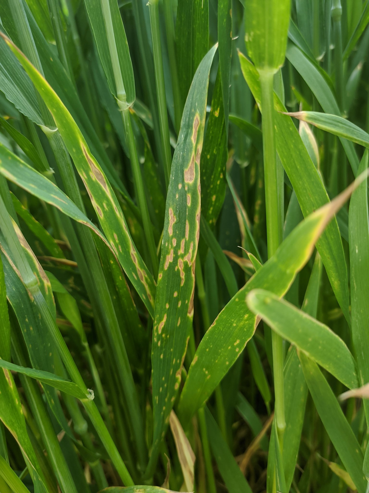 Das Fahnenblatt ist in der Gerste erreicht. Das Wetter, Regenschauer mit anschliessenden sonnigen Phasen, begünstigt Sprenkelnekrosen. Wo die letzte Fungizidbehandlung ansteht, ist daher auf eine gute Wirkung gegen Sprenkelnekrosen zu achten, zudem hilft die Beimischungvon Ethephon, um dem Ährenknicken vorzubeugen.