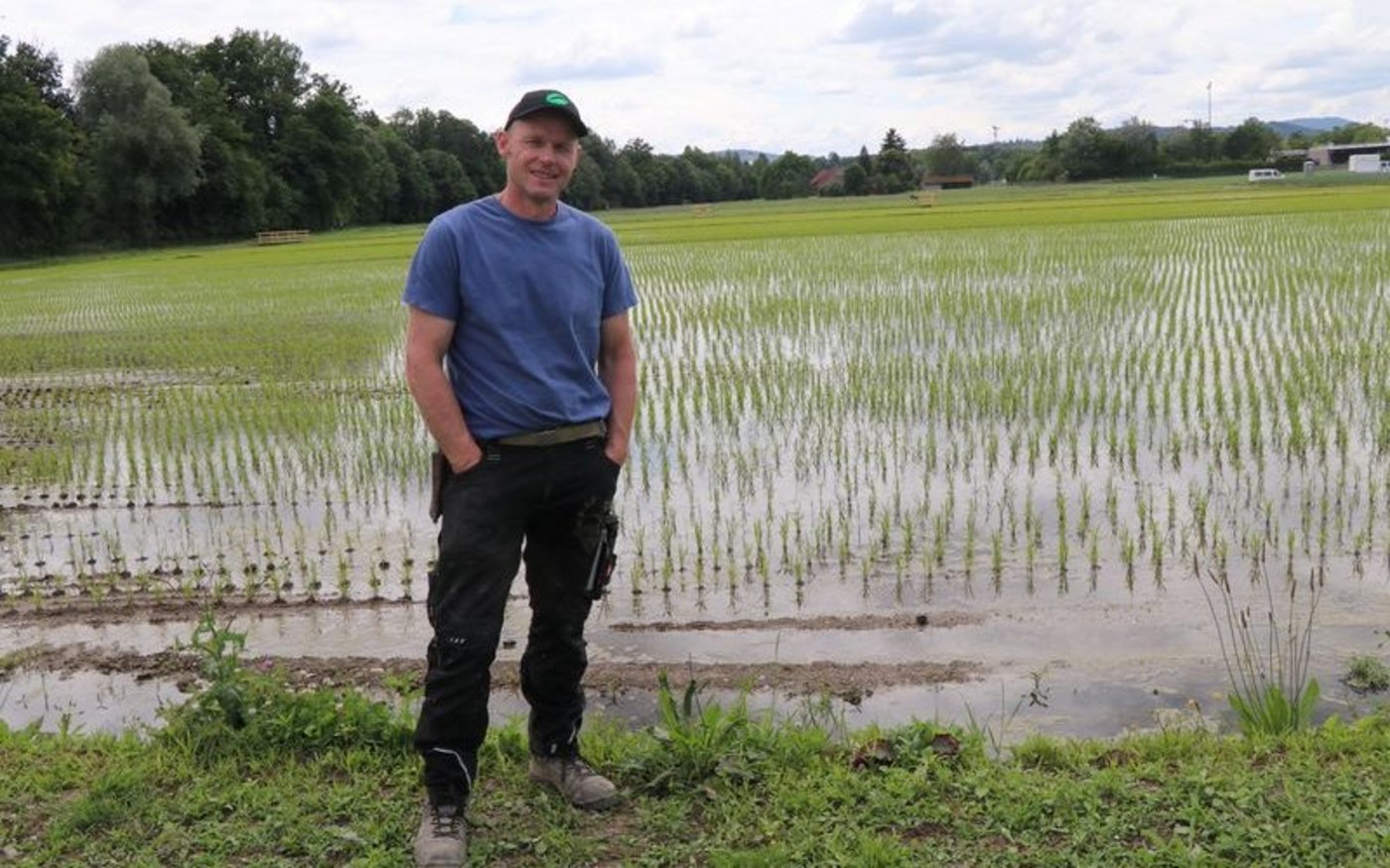 Frösche quaken und Libellen schweben im Tiefflug über das Wasser. Überall strecken Reispflanzen ihre Stängel aus dem seichten Wasser. Nein, wir befinden uns nicht in Asien, sondern in der Nähe von Brugg im Kanton Aargau. In Lauffohr wird bereits zum zweiten Mal Reis im Nassanbau angepflanzt. Toni Suter, Bereichsleiter bei Schwarz Gemüsebau in Villigen ist für dieses besondere Projekt zuständig. Zielstrebig geht er näher an das geflutete Feld heran. Rechts und links von ihm hüpfen Frösche davon. «Ich bin wirklich beeindruckt von der Biodiversität, die sich hier bereits entwickelt hat», sagt er.