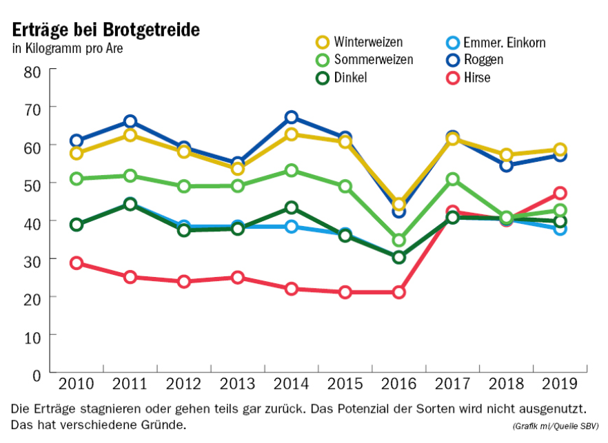 Der Selbstversorgungsgrad mit Weichweizen liegt in der Schweiz derzeit noch bei rund 78 Prozent. Das soll so bleiben, ist man sich in der Branche einig. Denn Brot sei ein Grundnahrungsmittel und die Brottradition, wie auch die Vielfalt, hierzulande hoch. Im Gegenzug nimmt aber die angebaute Fläche kontinuierlich ab. Um die Menge längerfristig zu halten, müssten daher die Erträge steigen. Mit dem herrschenden «Extensivierungskurs» ist das aber wohl eher nicht zu erwarten. Und die Bereitschaft der Bauern, Weizen anzubauen, ist nicht grösser geworden. So kämpft beispielsweise die Label-Organisation IP-Suisse seit mehreren Monaten an allen Fronten um neue Produzenten oder neue Flächen bei bisherigen. Aber neben der Bereitschaft, Brotgetreide anzubauen, scheinen auch die Ären und damit die Erträge «nicht in den Himmel zu wachsen».