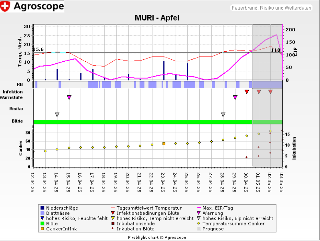 Auch das landwirtschaftliche Bildungszentrum Liebegg macht in seinem Newsletter auf die aktuell kritische Phase aufmerksam. Für vergangenen Mittwoch sagte das Feuerbrand-Prognosemodell Maryblyt Feuerbrand-Infektionen an den meisten Standorten voraus. Seit Mittwoch zeigt das Monitoring eine Warnung an. An gewissen Standorten sei der kritische Wert bereits erreicht. «Die anhaltenden hohen Temperaturen bis Samstag führen dazu, dass das Erreger-Infektionspotenzial ohne Behandlung weiterhin steigen wird. Wer eine Intervention plant, bzw. sich in einem Risiko-Sektor befindet (Feuerbrand in den Vorjahren), muss zwingend eine Behandlung durchführen und diese, bei anhaltenden Temperatur-Bedingungen, nach zwei Tagen wiederholen», heisst es.