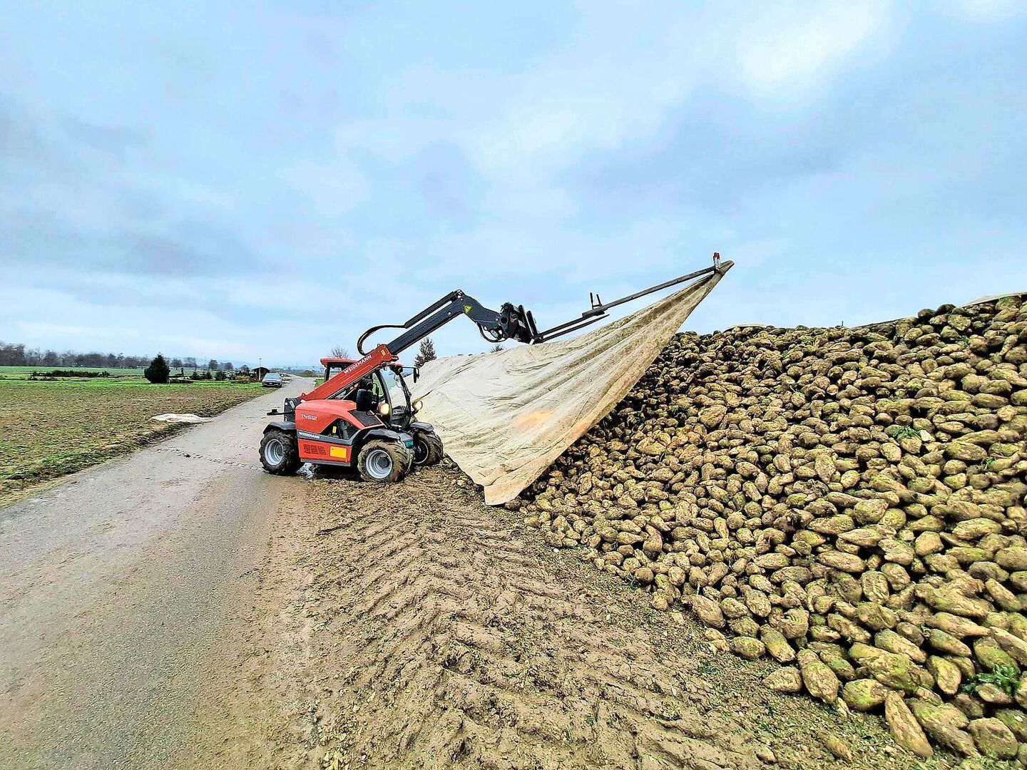 Wenn eine längere Feldlagerung unvermeidbar ist, muss die Miete vor den Wettereinflüssen mit einem atmungsaktiven und wasserabweisenden Vlies geschützt werden. Durch das Abdecken des Haufens können die Rüben etwas abtrocknen. Zum einen kann sich somit der angetrocknete Dreck an den Rüben beim Verlad lösen, zum anderen fällt das Fäulnisrisiko geringer aus. Auch wenn die Arbeit einen mühsamen Mehraufwand bedeutet, lohnt sich das Decken der Rübenmiete bei längerer Lagerzeit allemal.