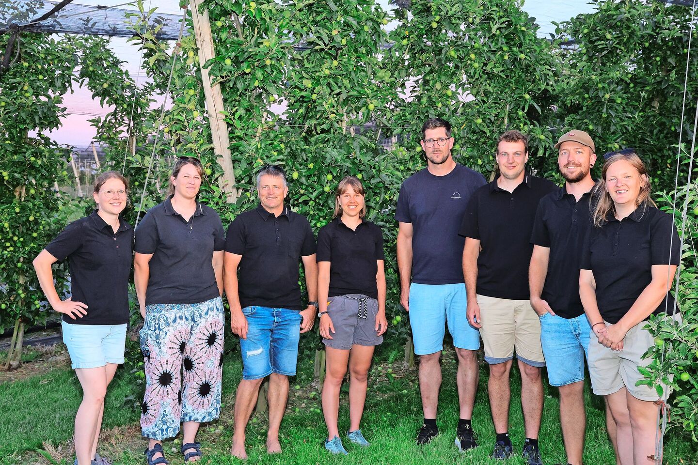 Nach der Information geht es in die Obstanlagen. Über zehn verschiedene Obst- und Beerenarten wachsen auf dem Schul- und Versuchsbetrieb Güttingen, über 100 verschiedene Sorten testen die Forscher auf ihre Praxistauglichkeit. In Kleingruppen führen die Mitarbeiter des Arenenbergs durch die Anlage. Für Patrick Stadler, Betriebsleiter Schul- und Versuchsbetrieb Güttingen, bot sich eine der letzten Gelegenheiten, «seine» Anlagen sowie ausgewählte Versuche und Sorten zu zeigen – Stadler verlässt den Arenenberg per Ende 2025 und wechselt zur Tobi Seeobst AG. Sein Nachfolger Florian Eltschinger, gelernter Obstfachmann aus Altnau, steht diesen Abend ebenfalls am Start.