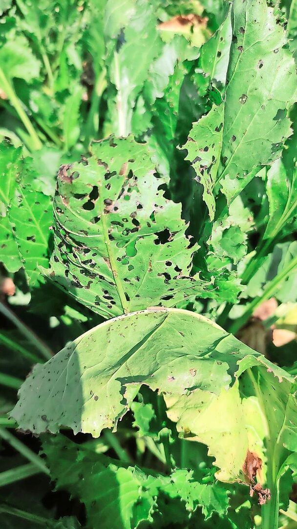 Beim Erdfloh sind typische kleine Frasslöcher der zweiten Generation am Blattwerk sichtbar. Der Schaden wird derzeit als gering eingeschätzt und rechtfertigt keine Bekämpfungsmassnahmen. Dennoch ist es wichtig, dass allfällige Ausbreitungen beobachtet und im Notfall gemeldet werden.
