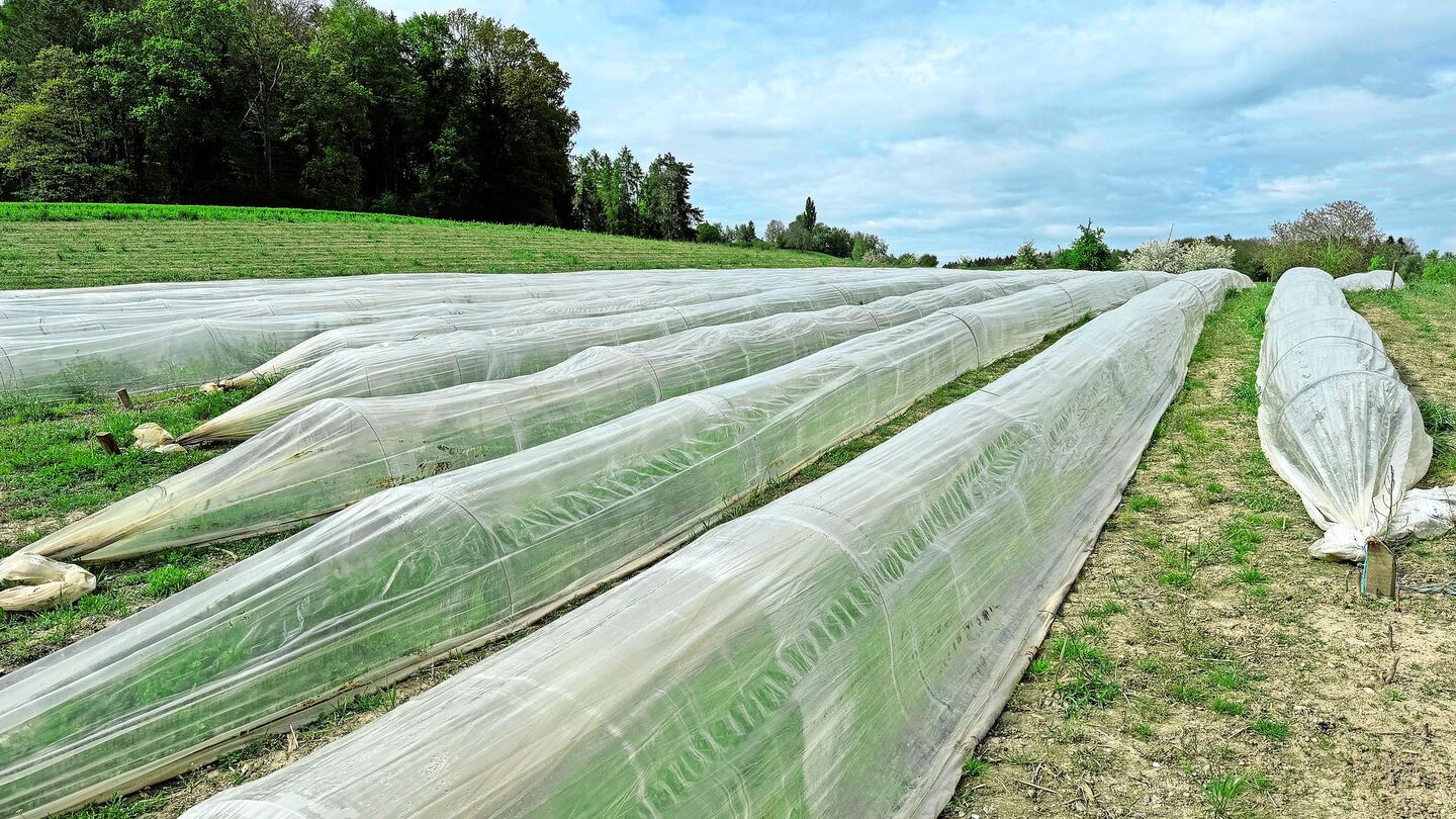 Die Erntejahre: Im Dritten Jahr rechnet man mit bis zu 50 Prozent Ertrag. Im Winter wird die gesamte Fläche gemulcht, die Dämme Ende Februar abgezogen. Auf einem Teil der Fläche werden Minitunnels erstellt, darunter treibt der Spargel schneller, und der Erntetermin verschiebt sich etwa drei Wochen nach vorn. Zwischen dem 20. und dem 25. März beginnt die Ernte; im Freiland ohne Tunnel erfolgt diese erst ab Mitte April. Anfang Juni wird schliesslich gedüngt, gefräst und angehäufelt. Gleichzeitig wird die Gründüngung eingesät und man lässt die Pflanzen wachsen.