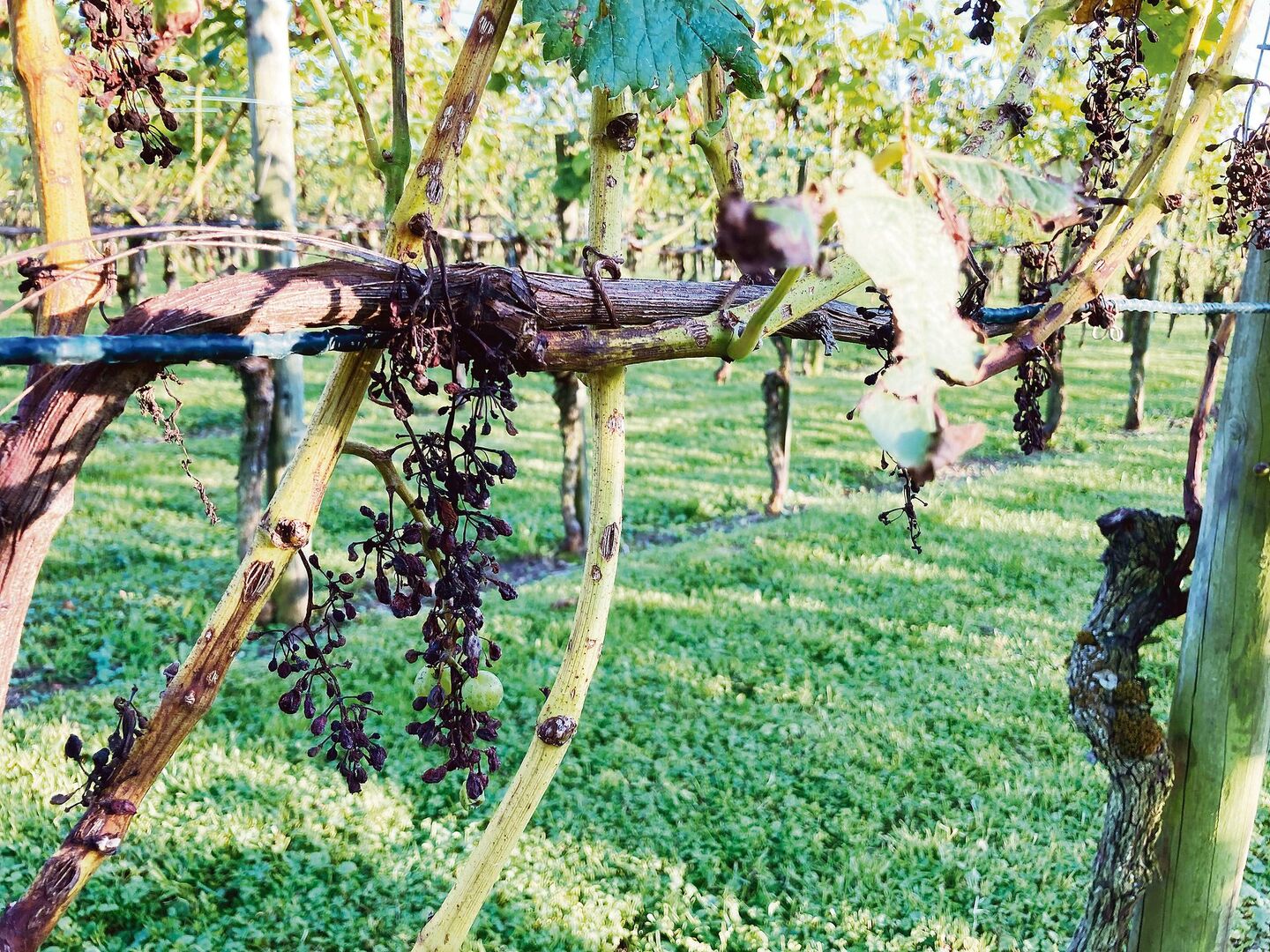 Zu der misslichen Lage hatte das diesjährige Wetter gleich mehrfach beigetragen: Zunächst gab es ein kühles Frühjahr, der Austrieb erfolgte spät. So wurde erst im Juni, als der Wuchs in Schwung kam, mit dem Spritzen begonnen. Mit dem häufigen Regen kam es zu vermehrtem Befall von Falschem Mehltau, worauf die Spritzintervalle verkürzt wurden. Im Juli nahm der Pilzdruck weiter zu, zudem führten Hagelstürme vielerorts zu grossen Schäden an den Trauben. So auch auf dem Weingut Hausammann, welches am 13. Juli besonders schlimm getroffen wurde. «Es gab praktisch keine Trauben, die nicht zerschlagen worden waren», stellte Betriebsleiter Urs Hausammann fest. «Die Schäden waren derart gross, dass wir den Entschluss fassten, diese Saison aufzugeben. So konnten wir Zeit und weiteres Spritzmittel sparen.»