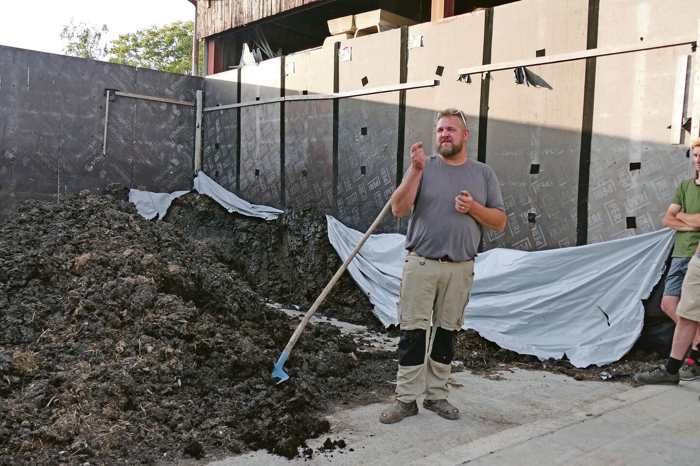 Auf dem Mistplatz präsentierte Anno Lutke Schipholt den Teilnehmerinnen und Teilnehmern den Hofmist, den er im Oktober aufgesetzt hat und der inzwischen fertig mikrobiell karbonisiert ist. Das Resultat, ein wohlriechender umgewandelter Hofdünger, nennt Demeter-Produzent Lutke Schipholt «Schwarzes Gold». Im Februar wurde ein Grossteil davon auf das Feld ausgebracht, auf dem nun Körnermais angepflanzt wird.