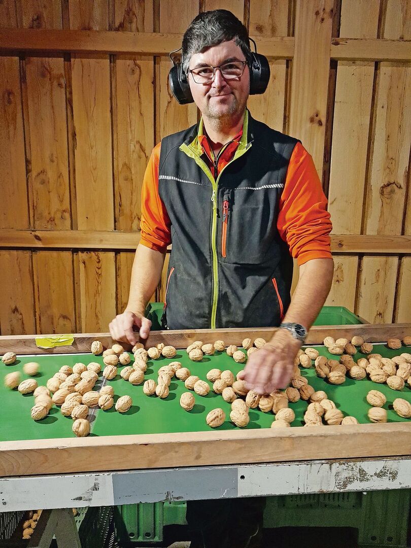 Was mit Handarbeit begann, wurde mit der Zeit immer mehr professionalisiert. Die Familie fand eine Waschanlage, einen Occasionstrockner und eine Auflesemaschine. «Seither können wir mechanisch auflesen», erzählt der Landwirt und strahlt dabei übers ganze Gesicht. In 1,5 Stunden können nun auf einer Fläche von einer Hektare die Nüsse aufgelesen werden. Dies geschieht alle drei Tage. Danach werden die Nüsse sofort gewaschen und getrocknet. Mittlerweile bringen andere Nussproduzenten ihre Ware zum Waschen und Trocknen bei Schallers vorbei. «Ich investiere vorneweg, was drin liegt», erklärt Urs Schaller seine Betriebsstrategie. Froh drum ist er angesichts der heutigen Lage, dass er den Trockner mit einer Schnitzelheizung betreibt und beim Bau nicht auf Gas gesetzt hat. Die neuste Errungenschaft ist ein Baumschüttler, den der Landwirt stolz in den sozialen Medien präsentierte.