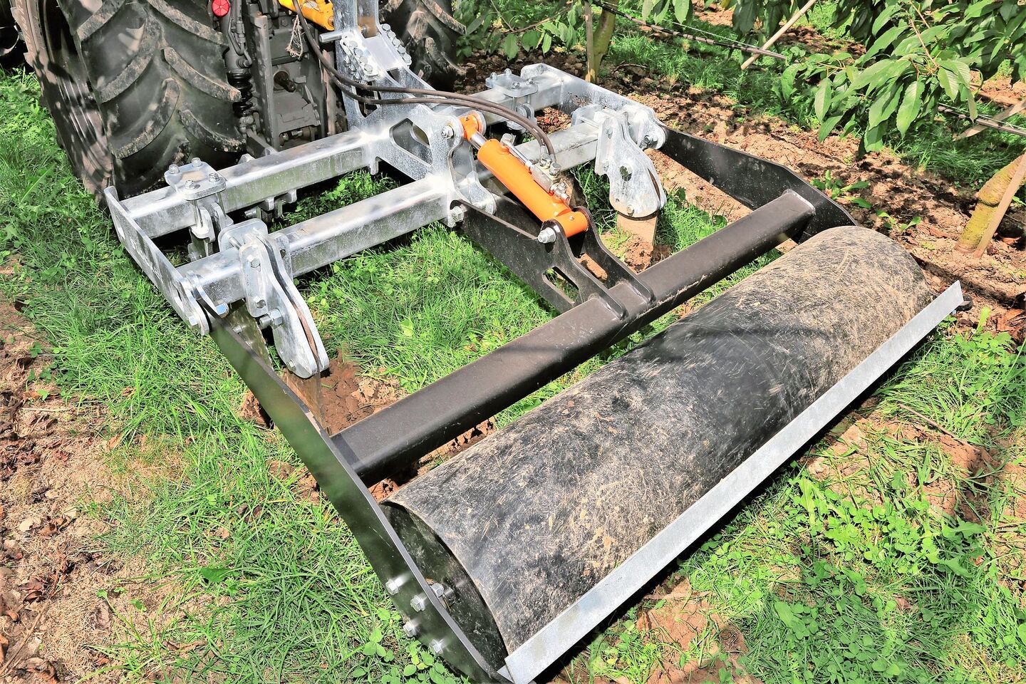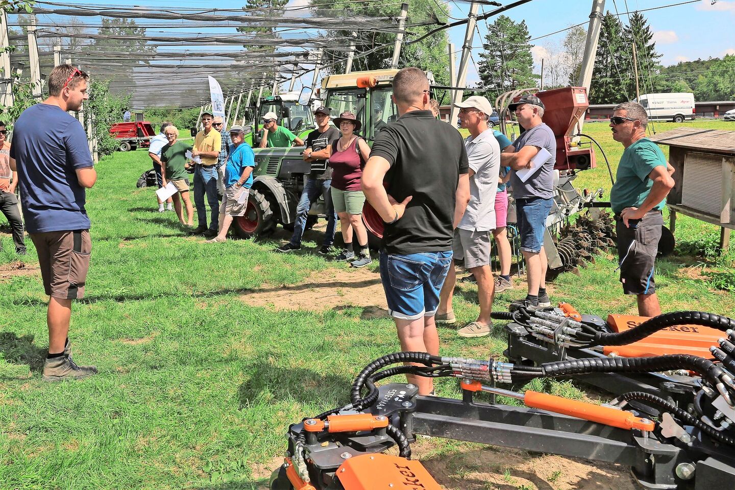 Das Befahren bei Nässe hinterliess die bereits erwähnten Spurrinnen in den Fahrgassen. Dass es in diesem Jahr in vielen Anlagen unschöne Bilder zu sehen gab, erkannte auch Obstbaudienstleister Manuel Estermann aus dem luzernischen Rain. Aus diesem Grund investierte er in einen Parapflug zur Fahrgassensanierung. Dieses aus dem Südtirol stammende Gerät konnte an der Steinobst-Begehung gleich im Einsatz beobachtet werden. Zudem führte Estermann auch mehrere Geräte zur herbizidfreien Unterstockpflege vor.