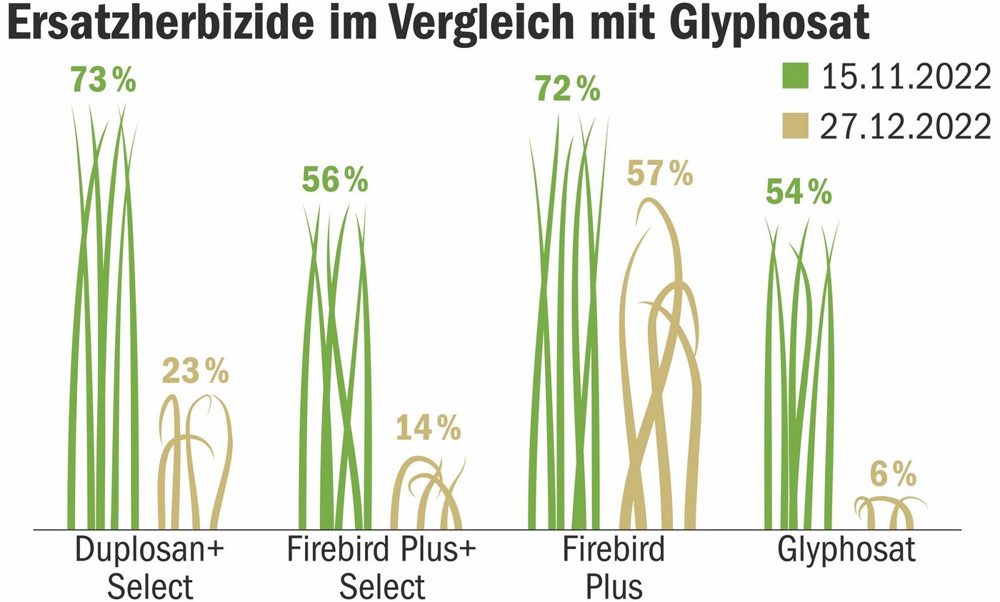 Anders sieht es mit Wuchsstoffherbiziden wie Duplosan KV Combi (Mecoprop-P + 2,4-D) aus, welche auch im Winter eingesetzt werden dürfen. Bei den Versuchen habe sich eine vielversprechende Wirkung in Kombination mit einem Gräserherbizid gezeigt. Agroscope testete Duplosan mit Select (Clethodim) bzw. Agil (Propaquizafop) und verglich deren Wirkung mit der von Glyphosat.