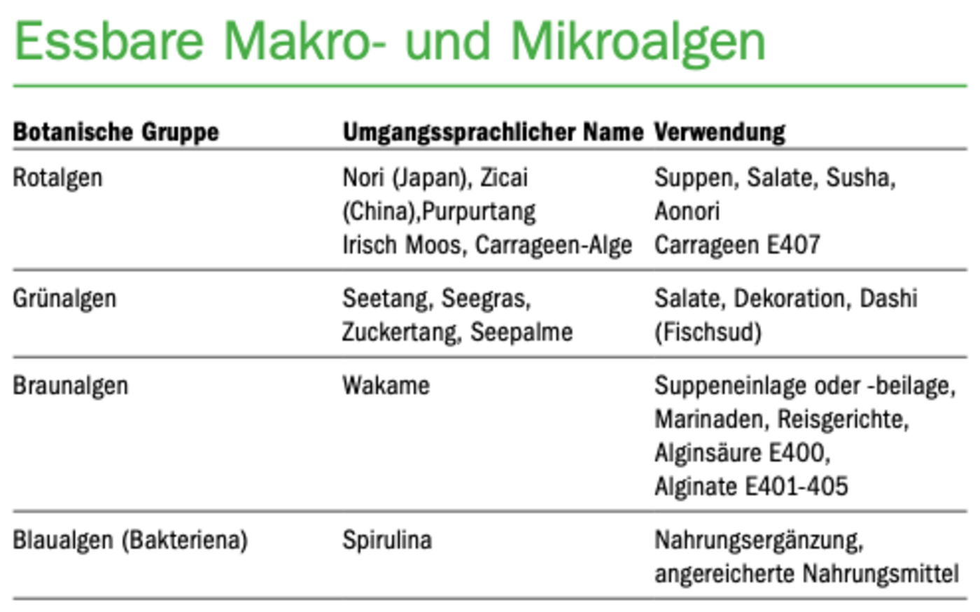 In Japan, Korea, China und anderen asiatischen Ländern gehören Algen zum festen Bestandteil der traditionellen Küche. Sie sind pflanzliche Proteinlieferanten, dazu reich an Mineralstoffen, Vitaminen, Nahrungsfasern und verleihen dem Essen einen charakteristischen Geschmack. Bei uns nimmt man sie fast nur als grünliche Hülle von Sushi, allenfalls als Nahrungsergänzung wahr. Als Gelier- und Verdickungsmittel ist Agar-Agar und Carrageen in Lightprodukten und als Hilfe gegen Trübung in Getränken auch bei uns in «aller Munde».