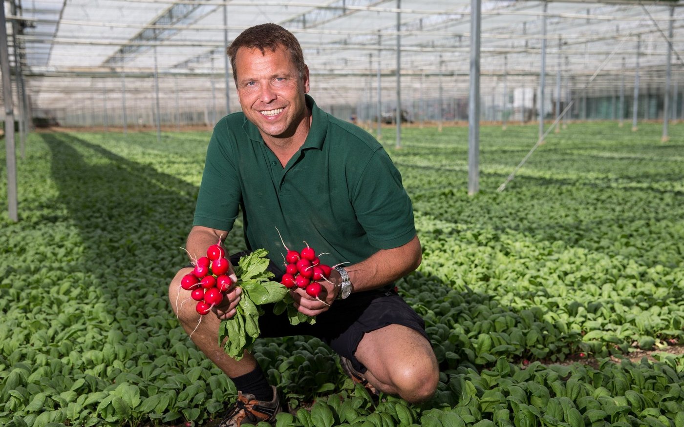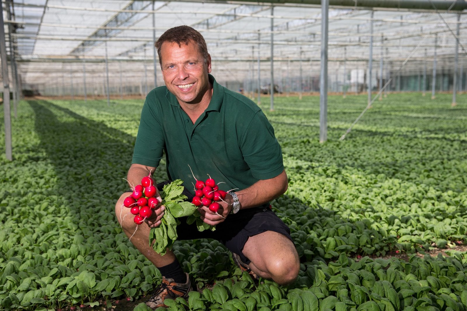 600 bis 800 Tonnen Radieschen produziert sein Betrieb Swissradies jedes Jahr und deckt damit einen Drittel des Schweizer Marktes ab. Auf 3,5 Hektaren unter Glas und in einer Hektare Hochtunnel wachsen die Radieschen rund ums Jahr. Auf der Freilandfläche von 12,5 Hektaren gedeihen von April bis Oktober im grossen Stil Bundzwiebeln. «95 Prozent unseres Einkommens generieren wir aus den Radieschen und beliefern sämtliche Grossverteiler», erklärt Frédéric Bart.