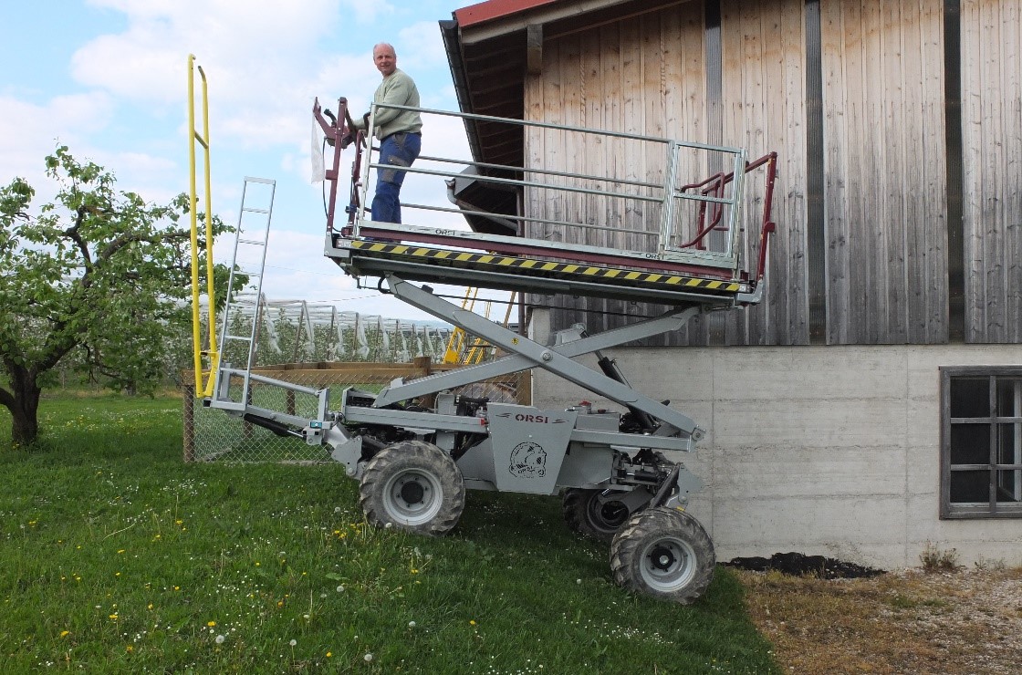 Bereits beim Transport der Arbeitsbühne zur Obstplantage müssen einige Punkte beachtet werden, wie die Einhaltung von max. zugelassenen Gewichten, die korrekte Beleuchtung und Markierung, die Ladungssicherung und die Vorgaben zum Transport gemäss Betriebsanleitung.