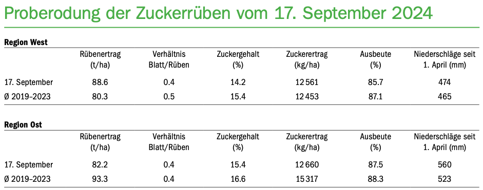 Die Zuckergehalte beider Regionen verweilen weiterhin auf einem tiefen Niveau. Während im Westen ein durchschnittlicher Zuckergehalt von 14,2 % gemessen wurde, lag er im Osten bei 15,4 %. Die deutlichen regionsabhängigen Unterschiede im Zuckergehalt und Rübenertrag gleichen sich ziemlich genau aus, wodurch beide Regionen einen bereinigten Zuckerertrag von gut 12 500 kg/ha liefern.