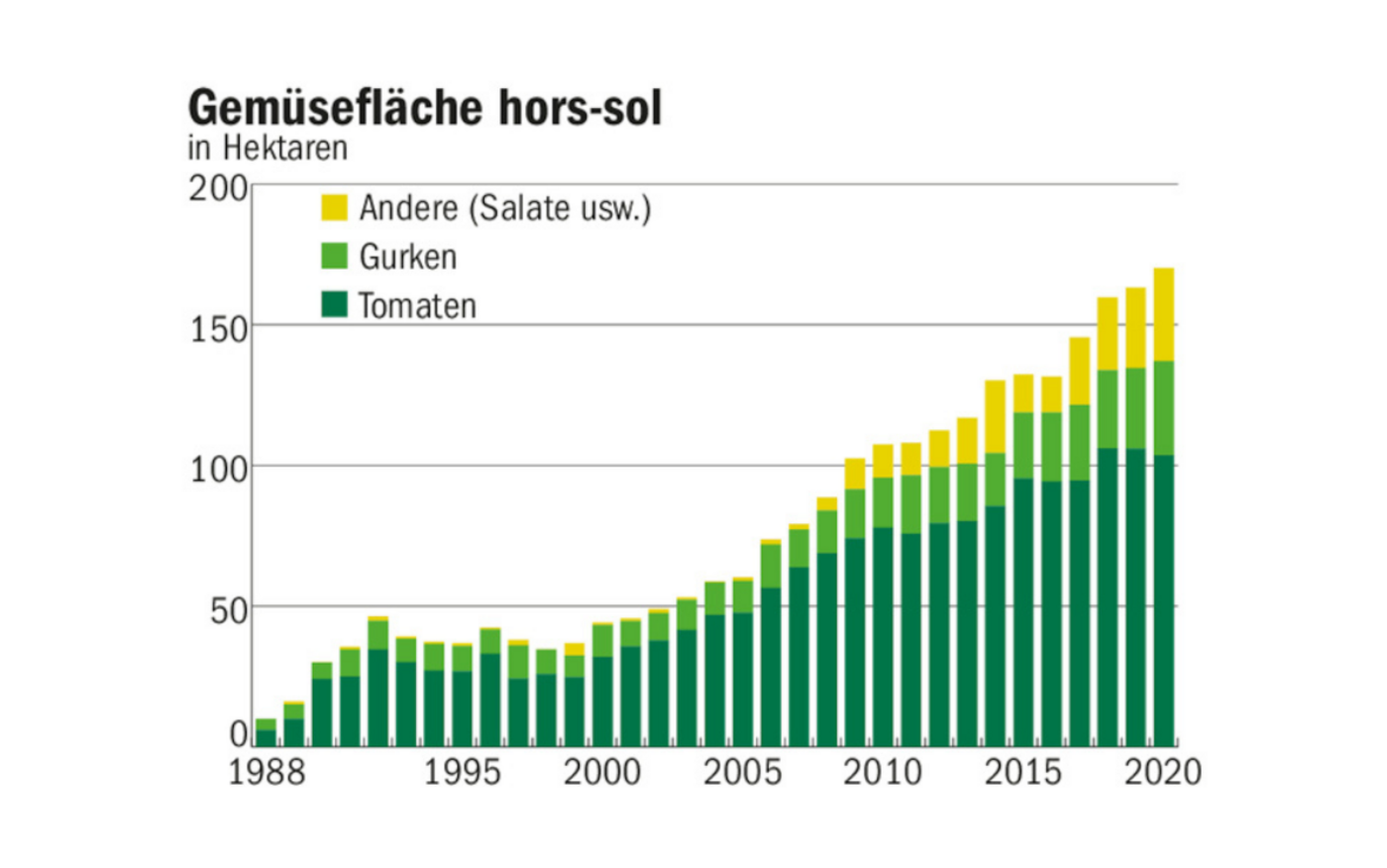 In den letzten 20 Jahren ist bodenunabhängige Gemüseproduktion in der Schweiz flächenmässig deutlich gewachsen. Gemäss Fachorganisationen aus der Branche bietet das System einige Vorteile: