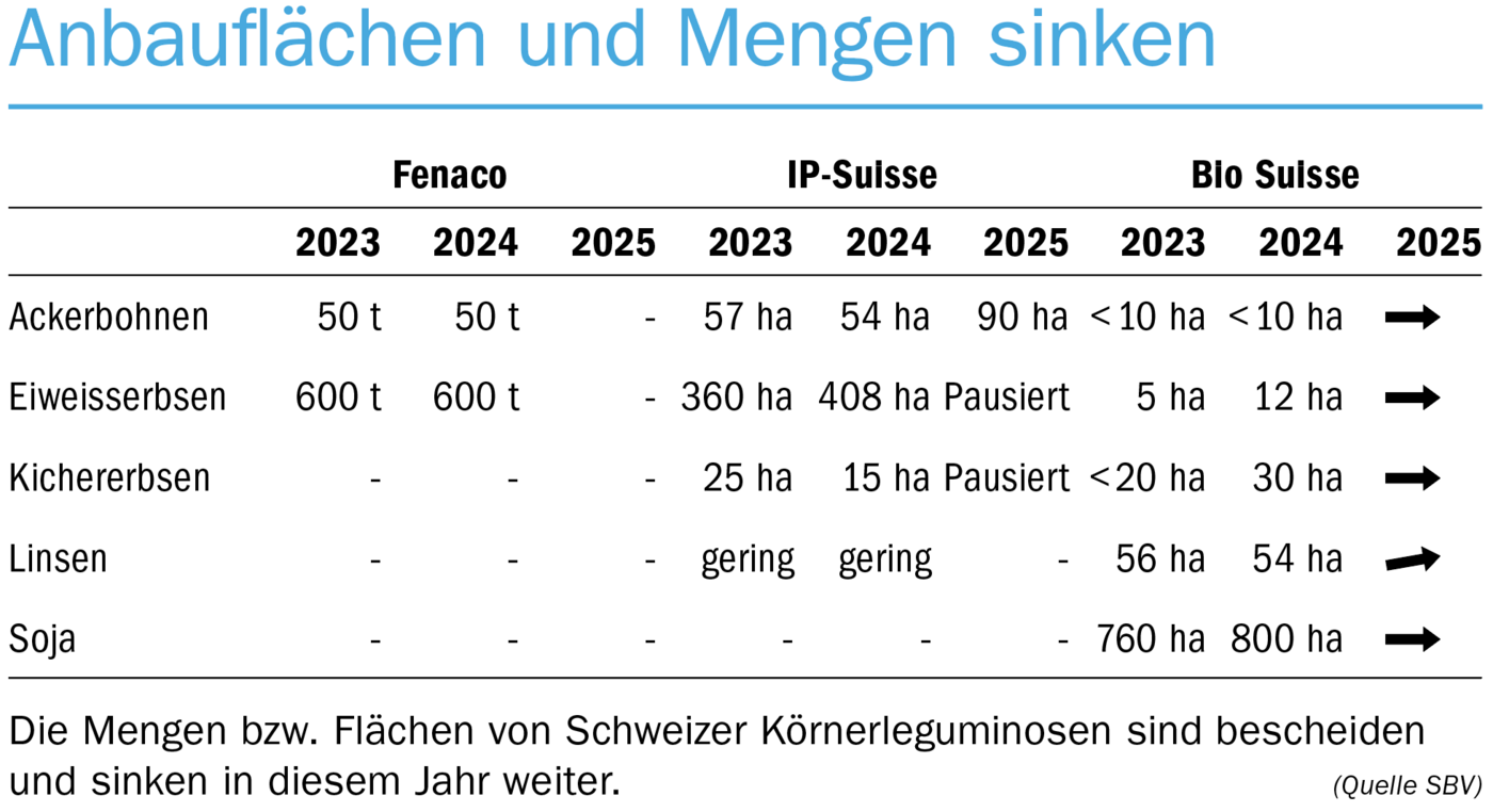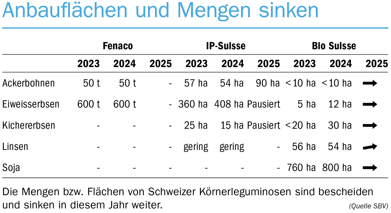 Der Detailhandel mache derzeit mit pflanzlichen Proteinprodukten pro Jahr einen Umsatz von knapp 230 Millionen Franken, erläuterte Marion Ramp vom Schweizer Bauernverband (SBV). Trotzdem bleibe der Bereich eine Nische, in der sich in den letzten Jahren ausserdem ein leichter Nachfrage-Rückgang zeige. Mit neuen Einzelkulturbeiträgen, einer Arbeitsgruppe bei Swissgranum, dem Engagement der Privatwirtschaft sowie der Gründung von Netzwerken und Vereinen gebe es zwar positive Entwicklungen. Allerdings lässt die Fenaco dieses Jahr keine Ackerbohnen und Eiweisserbsen mehr anbauen. IP-Suisse pausiert bei Eiweiss- und Kichererbsen, baut dafür aber mehr Ackerbohnen an.