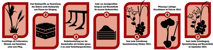 Insgesamt zeigt sich Urs Pulfer sehr zufrieden mit seiner Bodensanierung und dem Zustand seiner jungen Kirschenanlage. Die Mehrkosten hielten sich in Grenzen und würden sich dank gut etablierter Bäume und Einsparungen beim Pflanzenschutz bezahlt machen, meint der Baselbieter. Wahrscheinlich werde er auch nächstes Jahr eine Gründüngung in den Baumstreifen säen und dann eine Weile nicht mehr, bis die dickeren Kirschbäume weniger empfindlich gegen mechanische Unkrautbekämpfung sind. Allfälliges Unkraut will Pulfer aber künftig über den Winter stehen lassen, als Bodenbedeckung.