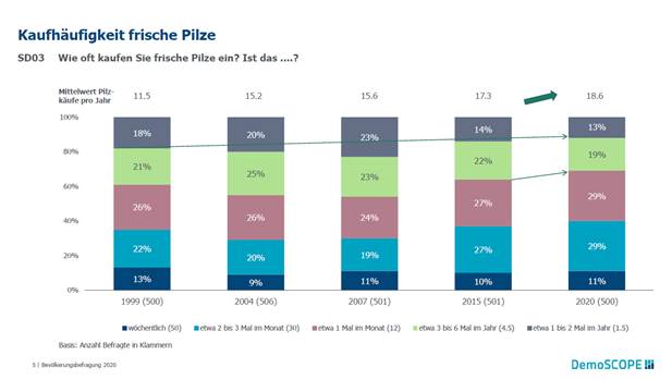 Die vom Verband Schweizer Pilzproduzenten VSP durchgeführte Bevölkerungsbefragung von Demoscope zeigt, dass die Kaufhäufigkeit bei frischen Schweizer Kulturpilzen vom Jahr 1999 - 2020 stetig zugenommen hat, schreibt der VSP in einer Medienmitteilung. 11 % der Befragten kaufen wöchentlich frische Pilze, dies mehrheitlich im Schweizer Detailhandel wie Coop oder Migros. 29 % der Befragten, die Mehrheit davon Männer, geben an, 2-3 mal pro Monat frische Schweizer Pilze zu kaufen.