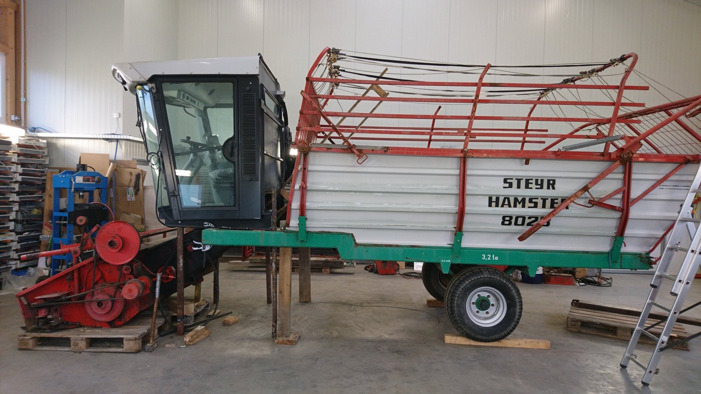 Aus einem Dumper, einem alten Mähdrescher und einem Hamsterladewagen hat Johannes Bergsmann aus dem österreichischen Hirschbach im Mühlkreis einen Kräuterernter gebaut.