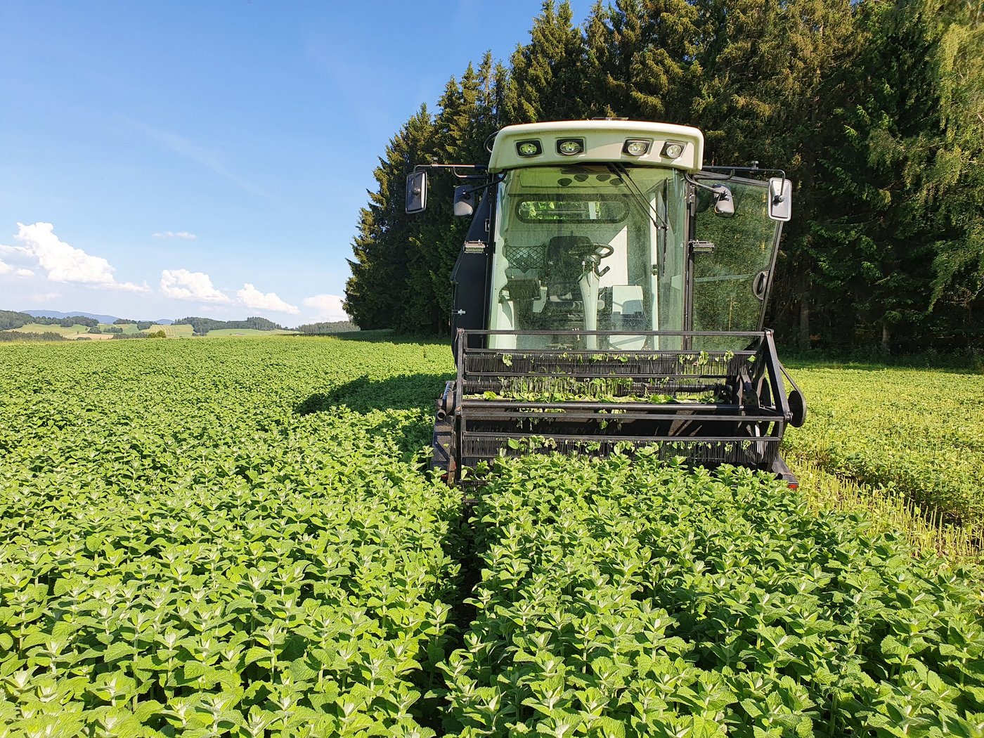 In etwa 250 Arbeitsstunden entstand sein bereits vierter Ernter, mit dem er diverse Minzen, Brennnessel und Drachenkopfmelisse erntet. Die Kabine wurde von einem finnischen Mähdrescher übernommen. Der Bunker war ursprünglich ein Steyr-Hamsterlade-wagen. Das zwei Meter lange Schneidwerk hat Bergsmann aus einem alten Mähdrescher gewonnen. «Mit einer Haspel, die schneller als üblich läuft, werden die losen, gelben Blätter der Kräuter abgerüttelt, bevor sie geschnitten werden. Eine geschlossene Bürste fängt den Jungpflanzenbestand besser auf als Metallfinger», sagt der Kräuterbauer. Neu hinzugekommen ist eine Pflückeinrichtung, die anstelle der Haspel aufgesetzt werden kann. Damit können die Blütenköpfe der Ringelblumen gepflückt werden.