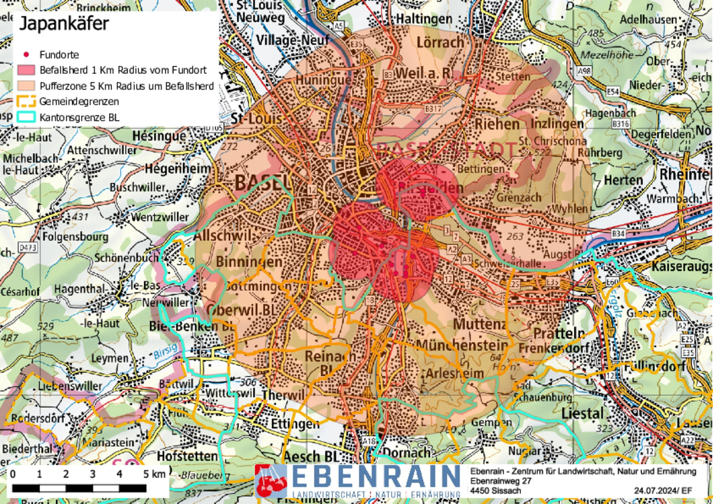 Diese Flächen wurden mittlerweile mehrmals gefräst und ganzflächig mit einer Folie abgedeckt. Ebenfalls wurden Gebiete der Kantone Basel-Stadt und Basel-Land in Befallsherde und Pufferzonen eingeteilt. Beide Kantone haben entsprechende Verfügungen erlassen und Massnahmen der Käferbekämpfung definiert (siehe Kasten). Ein Einsatz von Insektiziden wie in Kloten sei jedoch laut Börker wegen des Grundwasserschutzes nicht möglich.