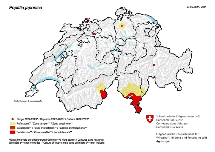 Dank der Alpen trat der Japankäfer bis vor zwei Jahren in der Schweiz einzig im Kanton Tessin auf. Aufgrund des hohen Käferdrucks aus dem umliegenden Italien mache hier eine Ausrottung wenig Sinn und der Bund verfolge darum, laut Sofia Stefani vom Bundesamt für Landwirtschaft, die Eindämmungsstrategie, die zum Ziel hat, die weitere Ausbreitung zu verhindern oder zu verlangsamen. Bei sämtlichen Käferfunden nördlich der Alpen verfolge man, laut Stefani, gemäss internationalen Abkommen eine Isolierungs- und Ausrottungsstrategie.