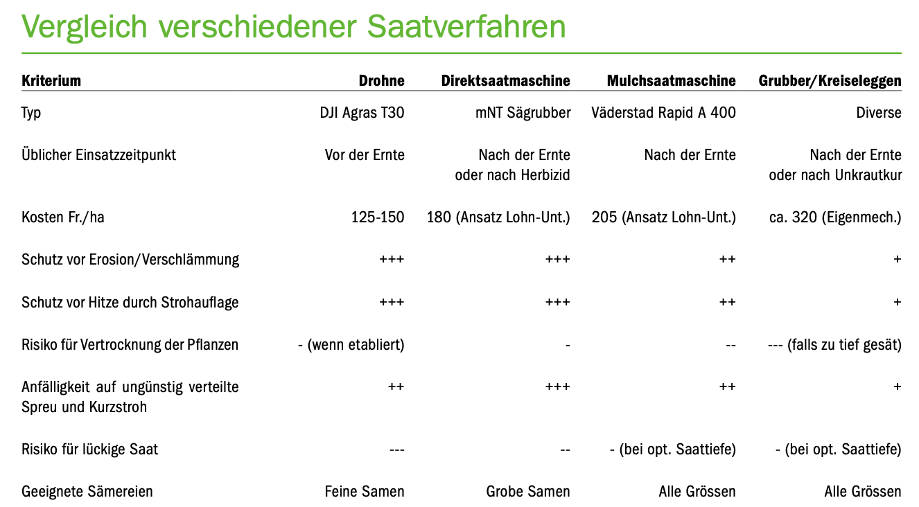 Der Zeitpunkt ist laut Bernhard Streit nun ideal, um die Mischung und den Maschineneinsatz zu planen. Dazu präsentierte er, neben den Maschinen vor Ort, eine Übersicht mit möglichen Saatverfahren und ihren entsprechenden Vor- und Nachteilen. «Wenn ich über eine Zinkenmaschine verfüge, dann ist der Fall klar: tief mähen und mulchen. Dann ist das Stroh kein Problem», sagte Streit und empfahl bei vielen Strohresten den Einsatz von Leguminosenmischungen, weil diese im Stroh besser kämen. Grundsätzlich sei die Gründüngung wegen ihrer Unkrautunterdrückung auch ein wichtiger Bestandteil des herbizidfreien Getreideanbaus.