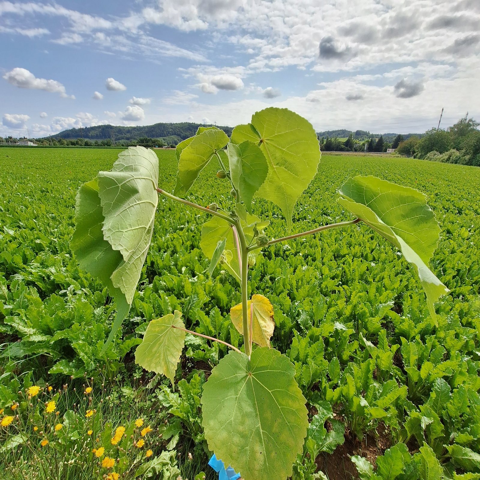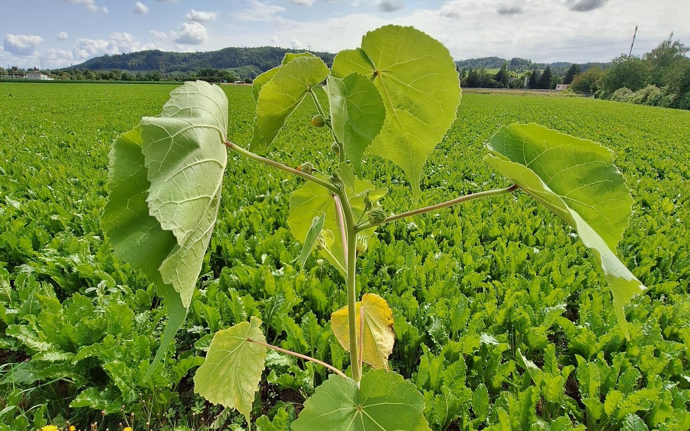 Die Samtpappel ist ebenfalls ein ungern gesehenes Unkraut, welches momentan in den Zuckerrüben anzutreffen ist. Aufgrund ihres Aufwuchses und der breiten Blätter ist sie von Weitem leicht mit Durchwuchs-Sonnenblumen zu verwechseln. Bei der Samtpappel handelt es sich um ein stark invasives und konkurrenzfähiges Unkraut, das die Kultur enorm unterdrücken kann.