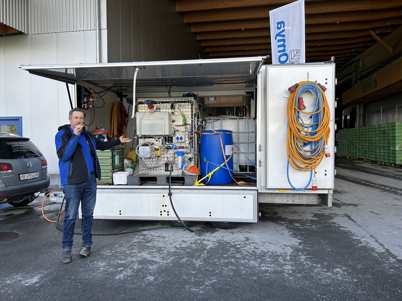 Guggisbergs Skumixanlage ist auf einem Anhänger aufgebaut und sorgt mit zwei Arbeitsplätzen für eine speditive Desinfektion des Gewächshauses. Der betroffene Betrieb muss Strom (32 Amperestecker) und Wasser zur Verfügung stellen. Das Wasser wird über eine Osmoseanlage standardisiert.
