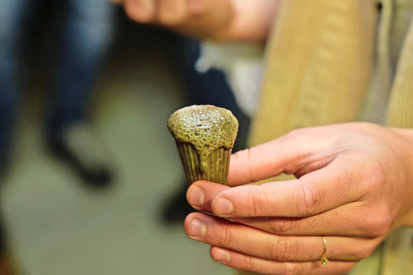 Die Erde im Papierbecher beginnt zu schäumen, geht auf wie ein Schoko-Muffin im Backofen und tropft auf den Boden. «Hoffentlich löst sich der Beton nicht auf», sagt Roman Anderegg. Die Landwirte lachen – die Stimmung lockert sich auf.