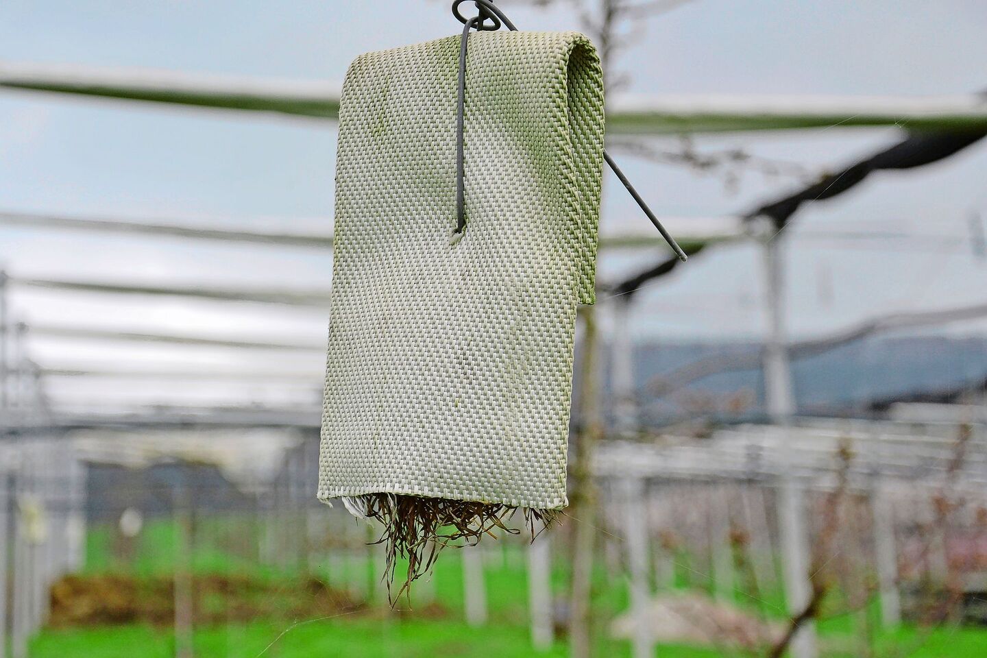 «Mit Neem versuche ich, den Lausdruck tief zu halten, bis meine Kavallerie anrückt», erklärt Marcel Itin und meint damit die Ohrwürmer. Für sie hat der Obstbauer Stücke ausgedienter Feuerwehrschläuche mit Holzwolle gefüllt und zwischen die Bäume gehängt – «Tontöpfe gehen schneller kaputt», bemerkt er. Wie die berittenen Einheiten eines Heeres kommen Ohrwürmer in grosser Zahl und machen den Läusen schnell den Garaus, so seine Erfahrung. «Sie fressen auch mal eine Kirschessigfliege, wenn sich die Gelegenheit dazu bietet.» Zugunsten von Nützlingen verzichtet er darauf, sämtliches Unkraut aus seiner Anlage zu putzen. «Ich hacke die Baumstreifen, um die Konkurrenz im Frühling tief zu halten», stellt Itin klar. Das bedeutet, dass später, den Sommer hindurch und im Herbst, verschiedene Pflanzen unter den Bäumen aufkommen können. Wenn dann z. B. die gemeine Melde voller Läuse hängt – die für die Kirschen ungefährlich sind – beschert das auch den Obstbau-Nützlingen einen willkommenen Zusatz-Lebensraum mit Nahrung und zur Vermehrung.
