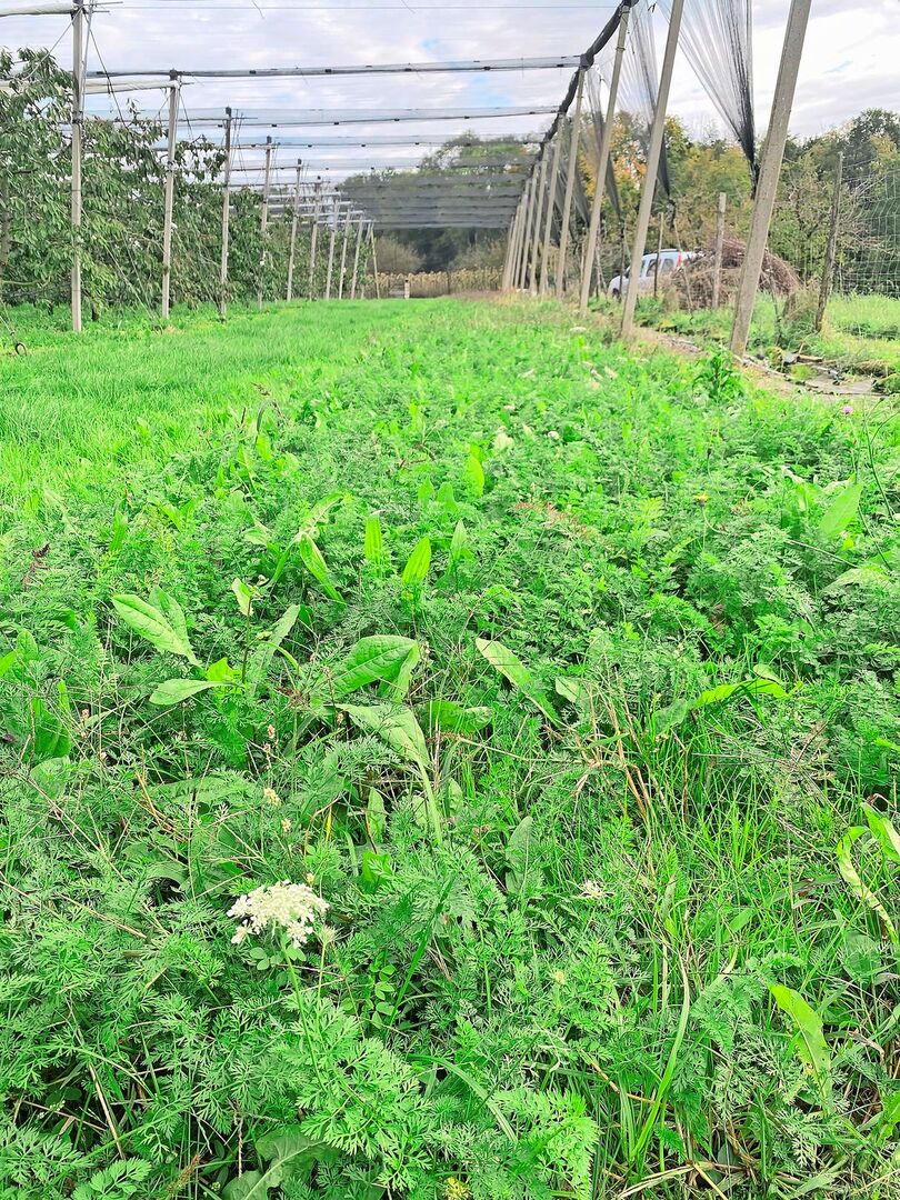 Im Gegensatz zu den Blühboxen des Ebenrains sind die Blühreservoirs des FiBL als streifenförmige Mischungen aus 20 Kräutern und zwei Gräserarten innerhalb der Insektenschutznetze am Rand der Anlagen angelegt – also in einem ansonsten ungenutzten Bereich. «Die Reservoirs sollen quasi als Speicher für Nützlinge dienen», erklärt Lara Reinbacher. Die 2–3 m breiten Streifen verlaufen auf der ganzen Länge einer Anlage und sorgen für ein möglichst durchgehendes Blühangebot mit für Nützlinge attraktiven, einheimischen Pflanzen. Für die Reservoirs ist eine extensive Pflege mit einem Schnitt pro Jahr vorgesehen.